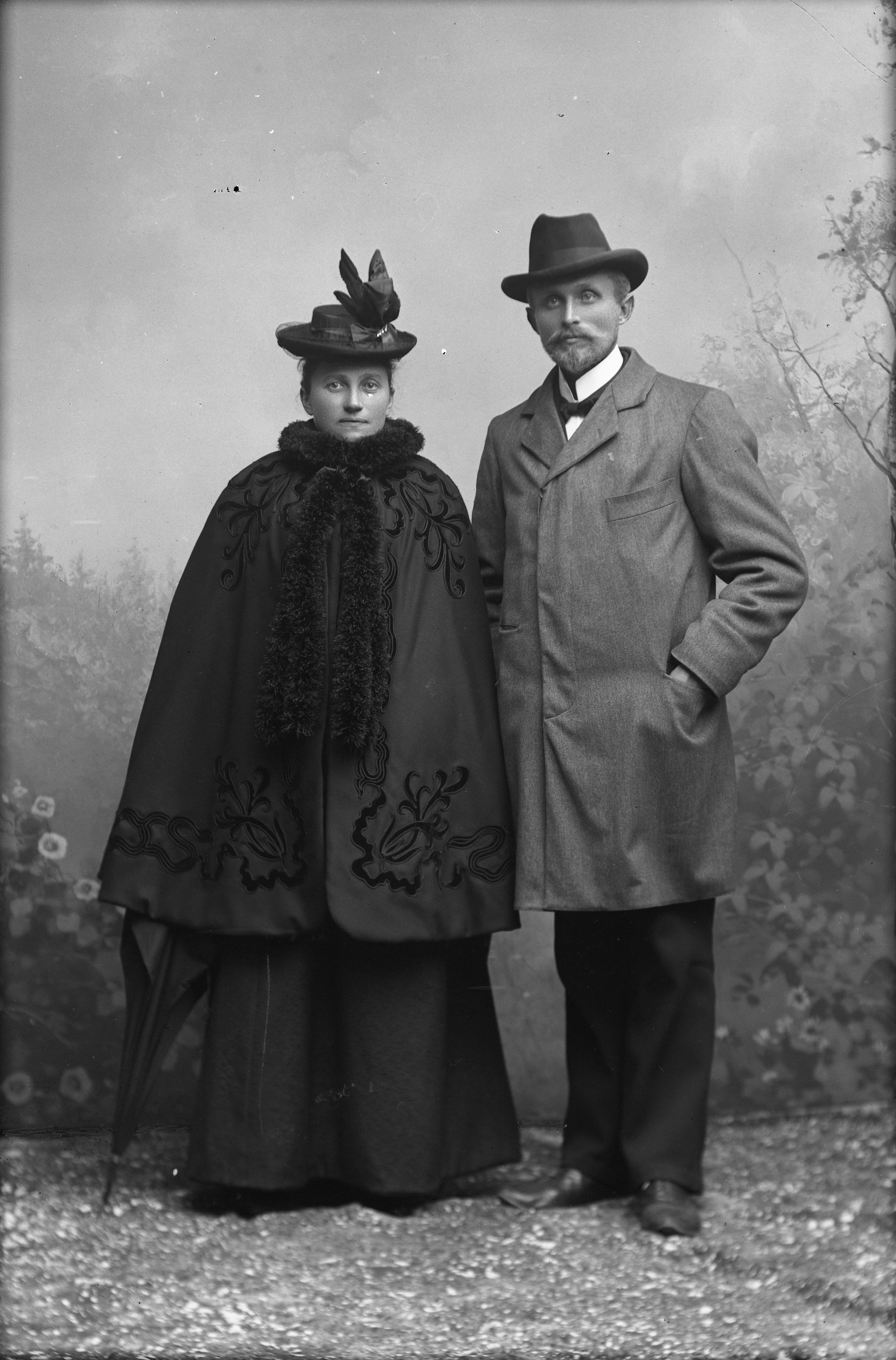 Porträtt i helfigur av herr Mattson med fru, båda iklädda hattar och ytterkläder. Frun även med handskar. Fotograferade framför ateljéfond.