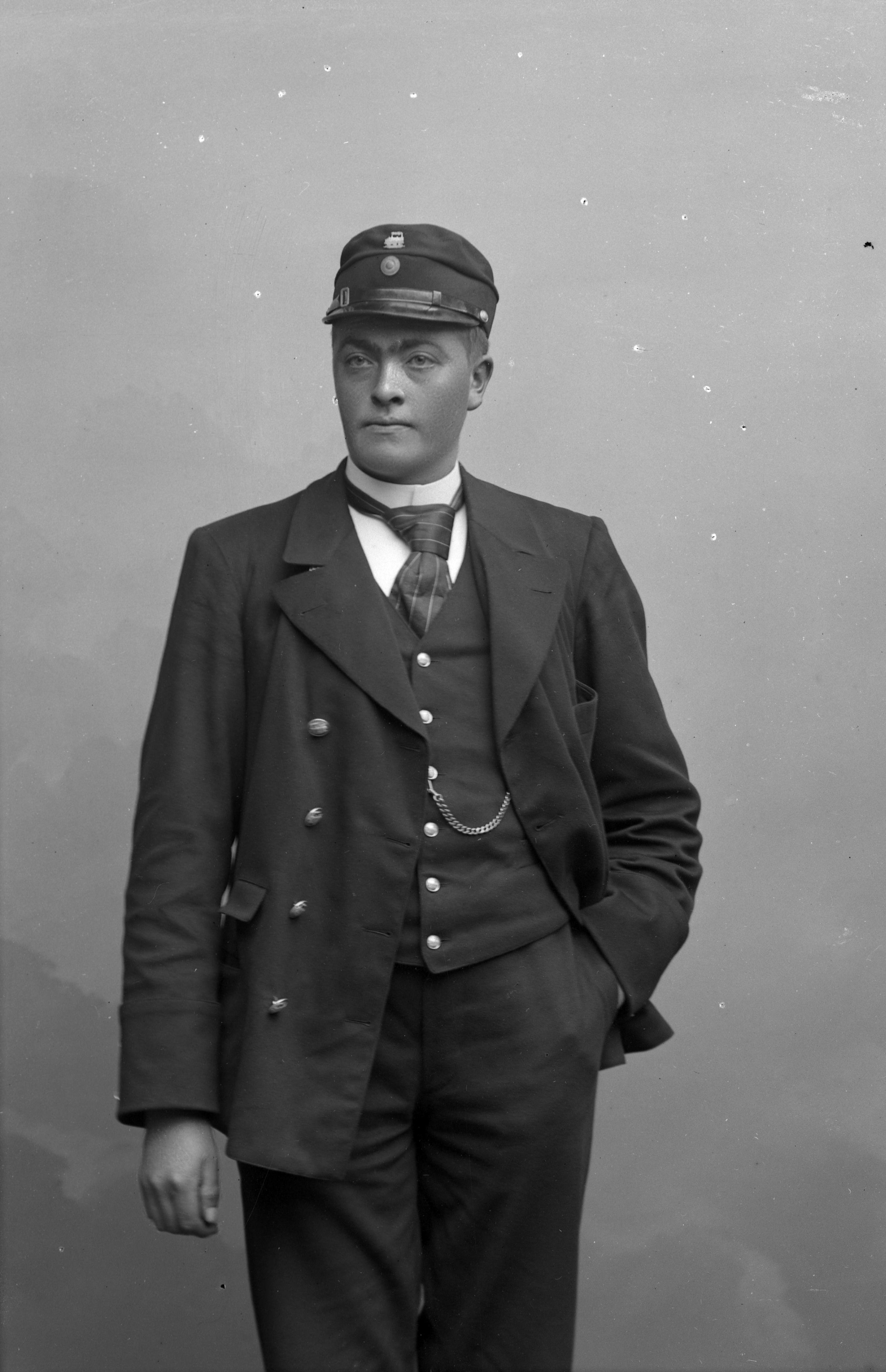 Porträtt i helfigur av A. Andersson, iklädd yrkesuniform, möjligen från privat järnvägsbolag.