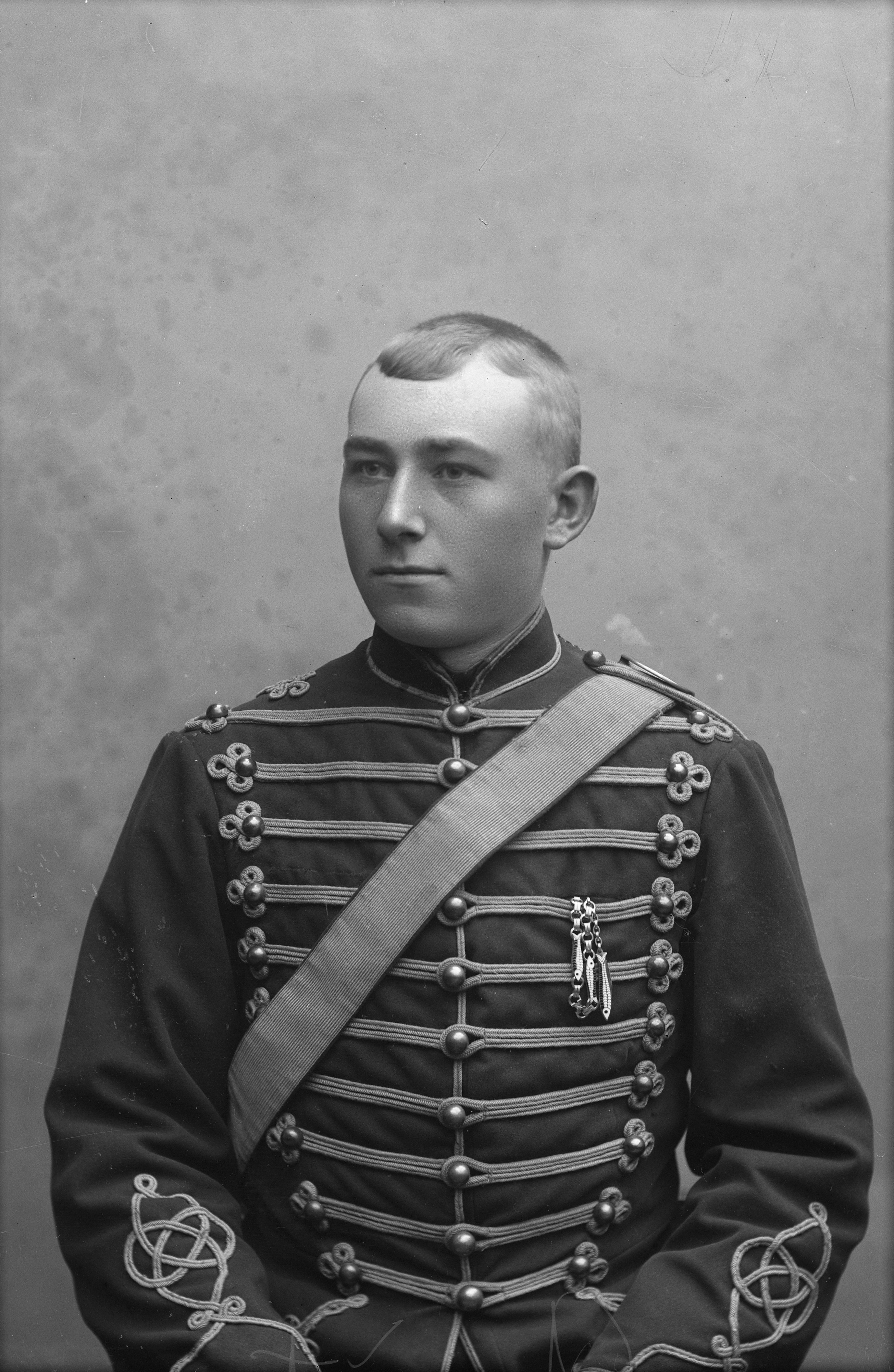 Porträtt i halvfigur av soldaten Quist i militäruniform.