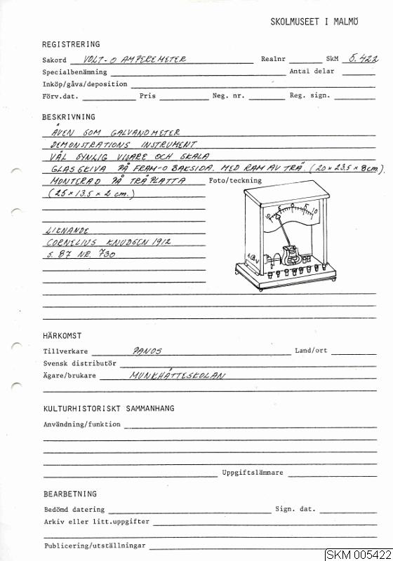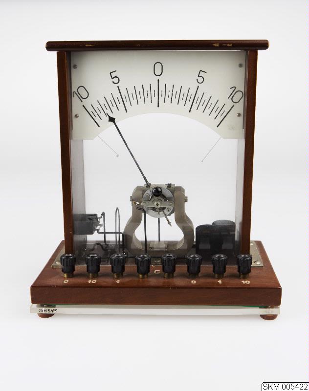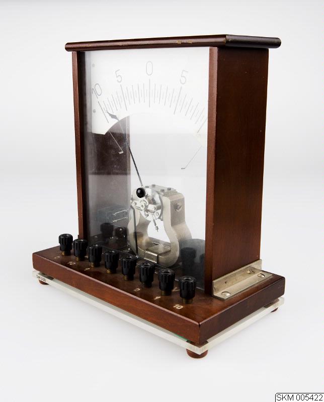 - Kombinerad volt- och amperemeter från Panos. Även som galvanometer. Demonstrationsinstrument. Väl synlig visare och skala. Glasskiva på fram- och baksida med ram av trä. Monterad på träplatta.