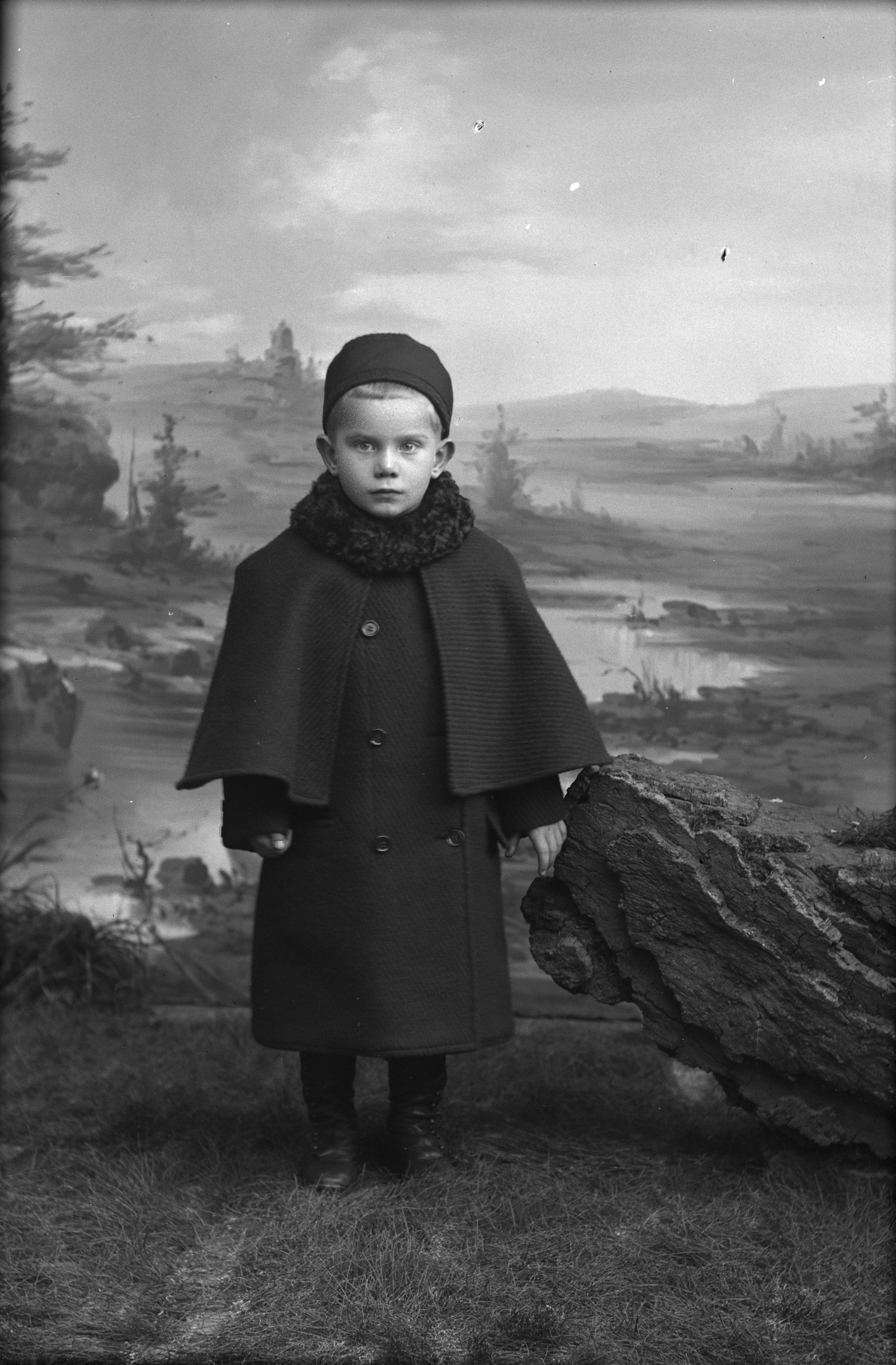 Porträtt i helfigur av fru Thulins son, iklädd mössa och ytterkläder, fotograferad framför ateljéfond.