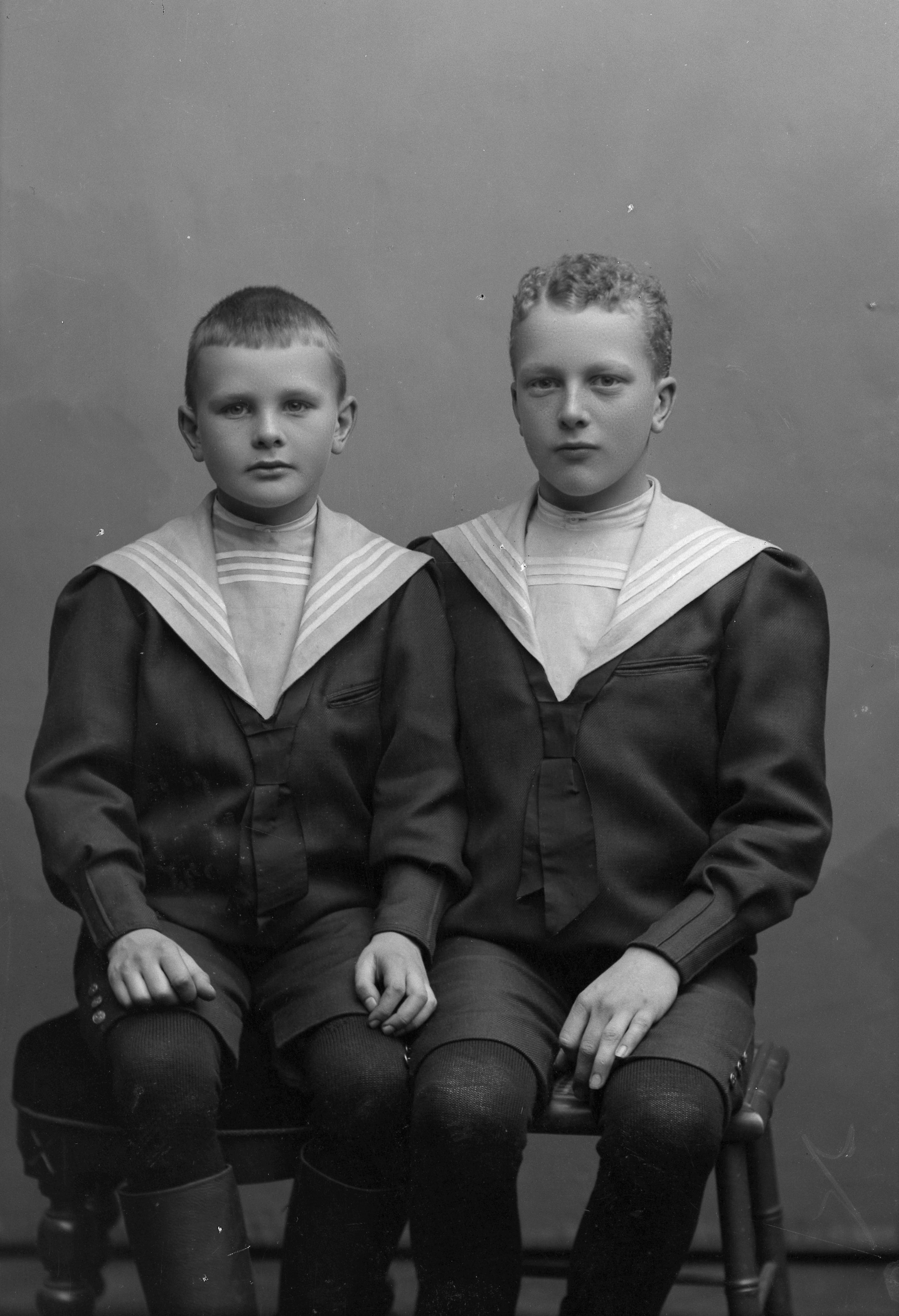 Porträtt i helfigur av Gunnar och Ivar Thomée, båda i sjömanskostym, sittande tillsammans på pall.