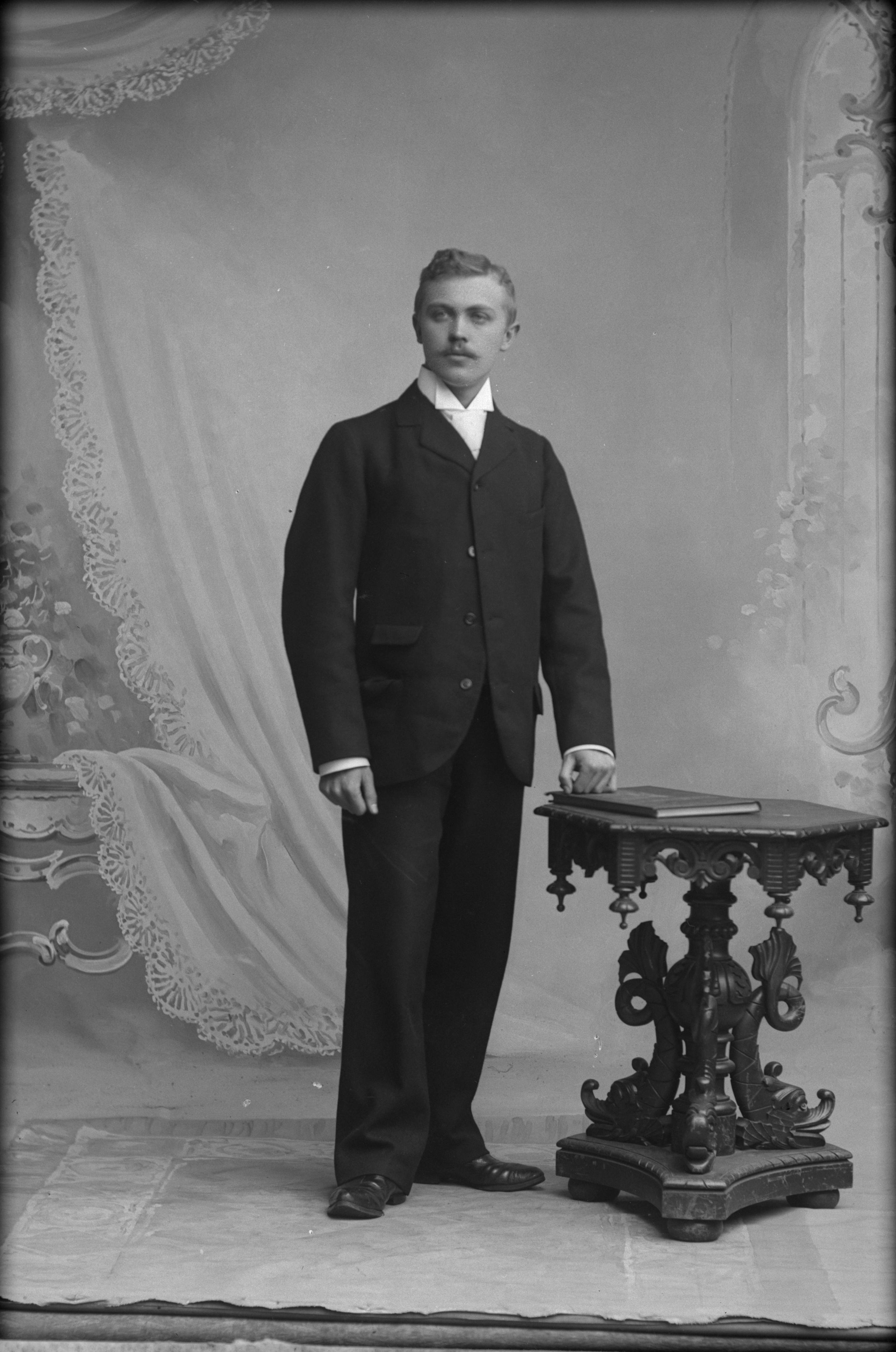 Porträtt i halvfigur av A. Lindquist vid Carl Lunds Fabriks AB, stående vid skulpterat pelarbord. På bordet ligger en bok.