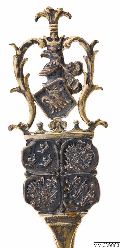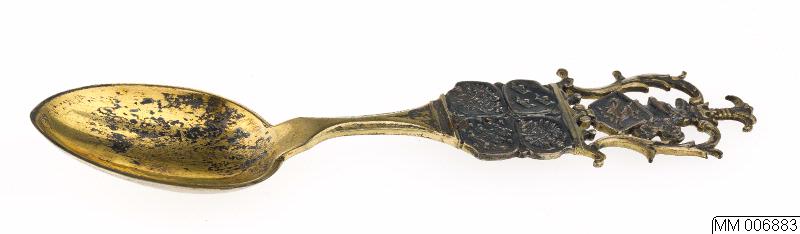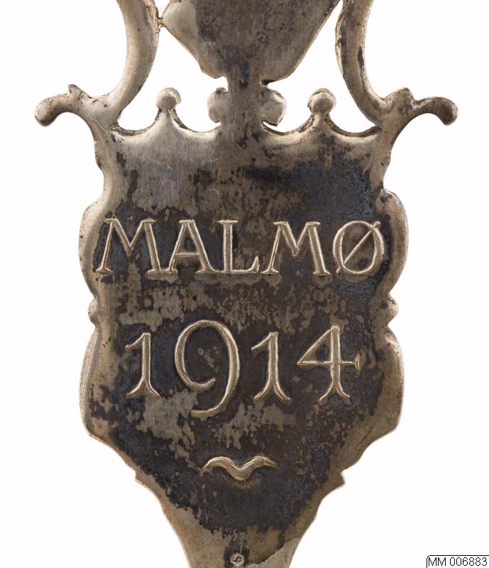 "Den baltiske ske" av silver, delvis förgylld, å skaftets framsida överst Malmö vapen, därunder i ett fyrklöver Sveriges, Danmarks, Tysklands och Rysslands vapen å skaftets baksida inskrift Malmö 1914. Stämplar: tre kronor, S.