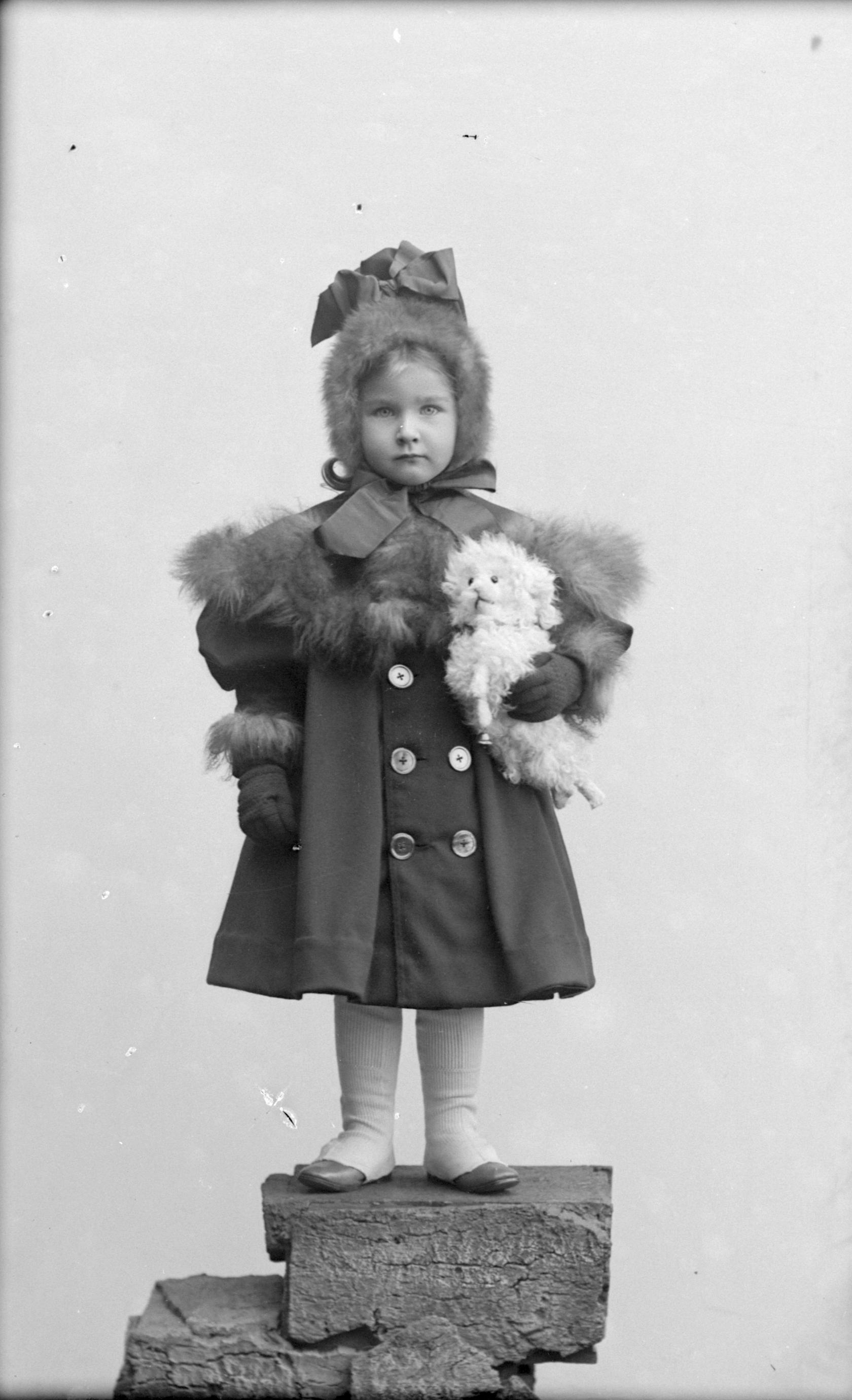 Porträtt i helfigur av Harriet Dieden i ytterkläder och mössa, stående på stenmur, hållande ett leksaksfår.
