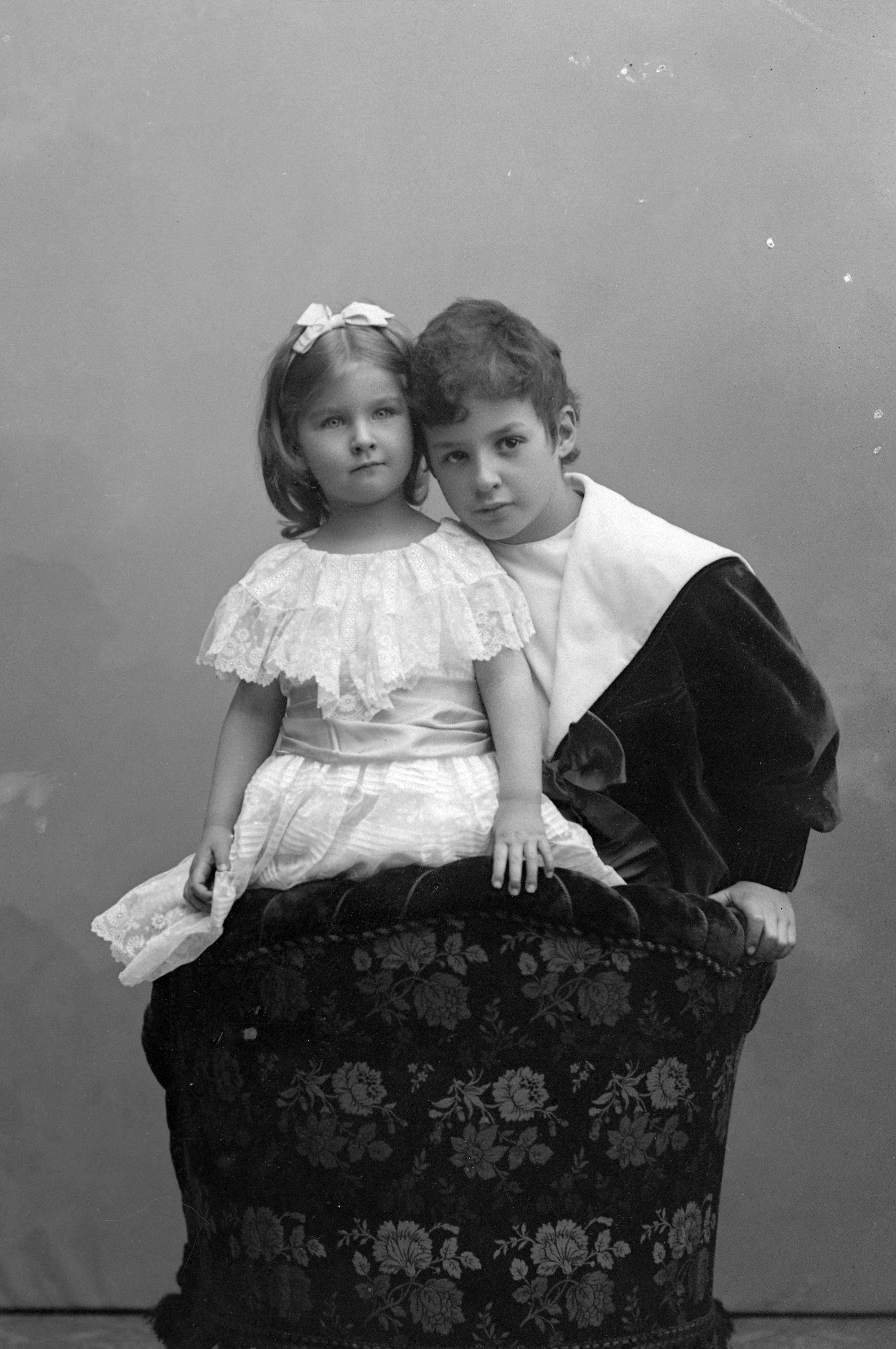 Porträtt i halvfigur av Erik och Harriet Dieden, stående på stol med ryggstödet framför sig. Sonen iklädd sjömanskostym, dottern med rosett i håret.