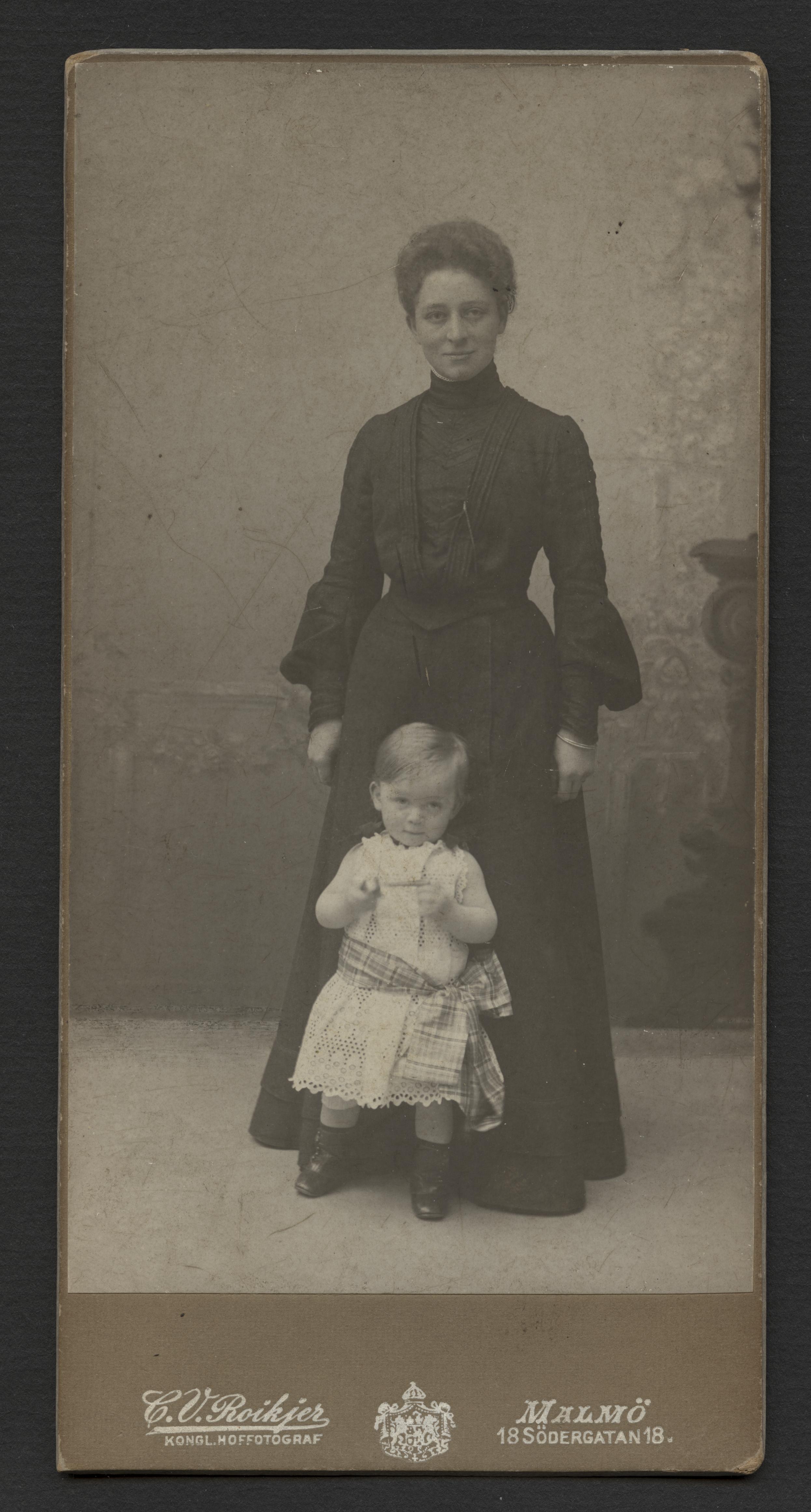 Kvinna med pojke som heter Kjell Roikjer 1 1/2 år. Vintertid 1902.