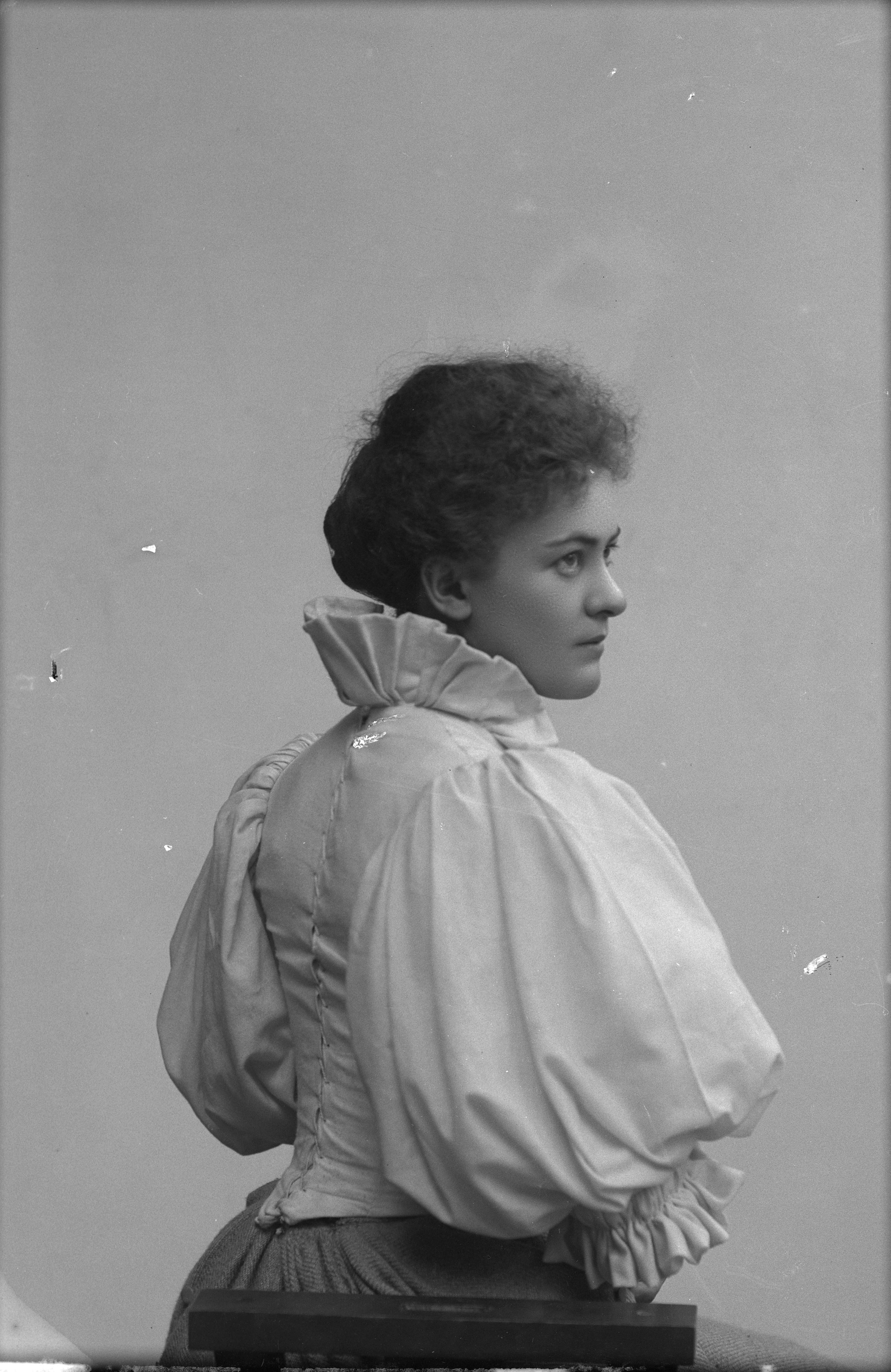 Porträtt i halvfigur av klädsömmerskan Ragnhild Landgren. Hon är fotograferad med ryggen snett mot kameran, ansikte i profil.