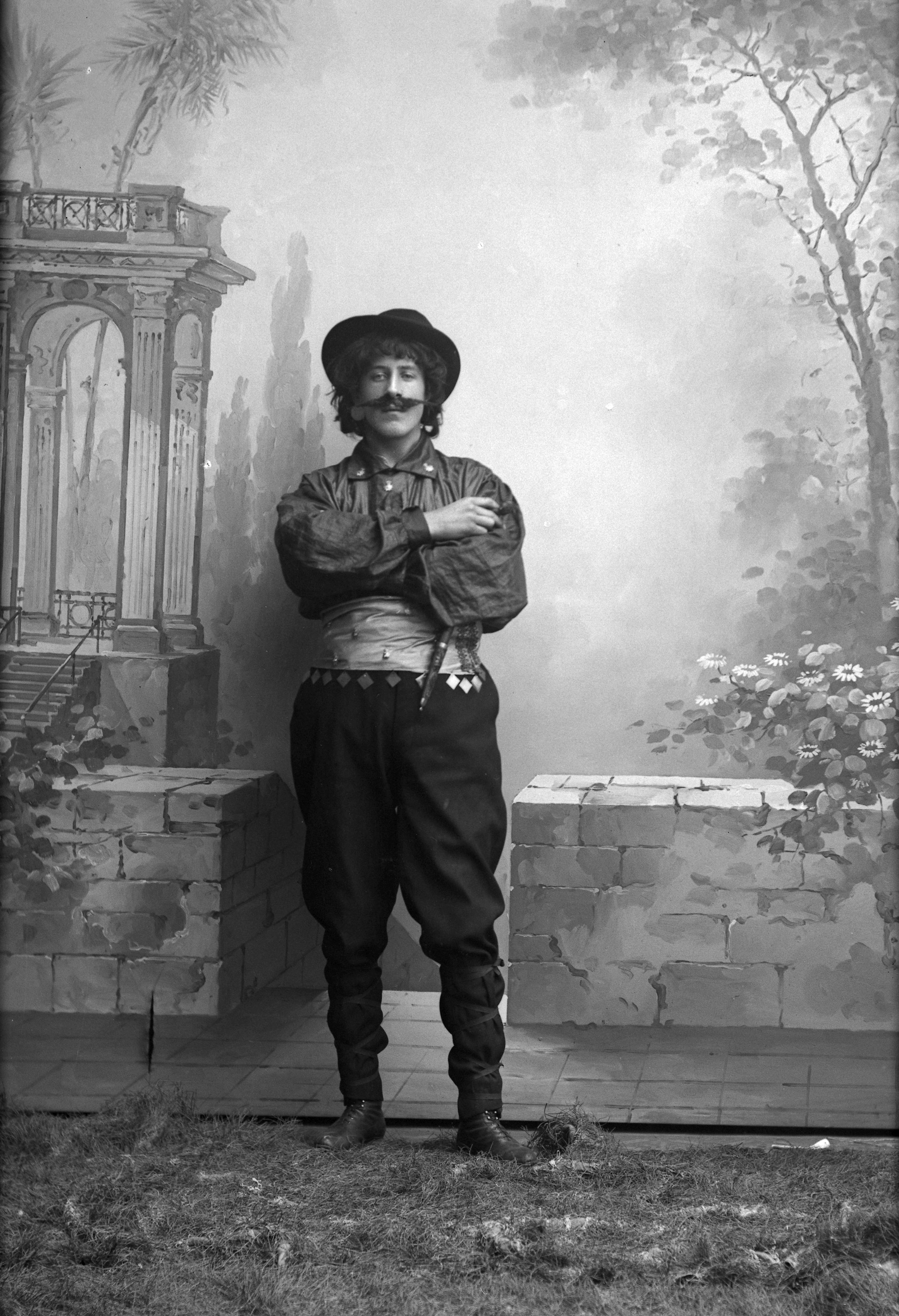 Porträtt i helfigur av H. Andersson vid C. & M. Fougstedt, iklädd teaterkostym och hatt. Fotograferad framför ateljéfond.