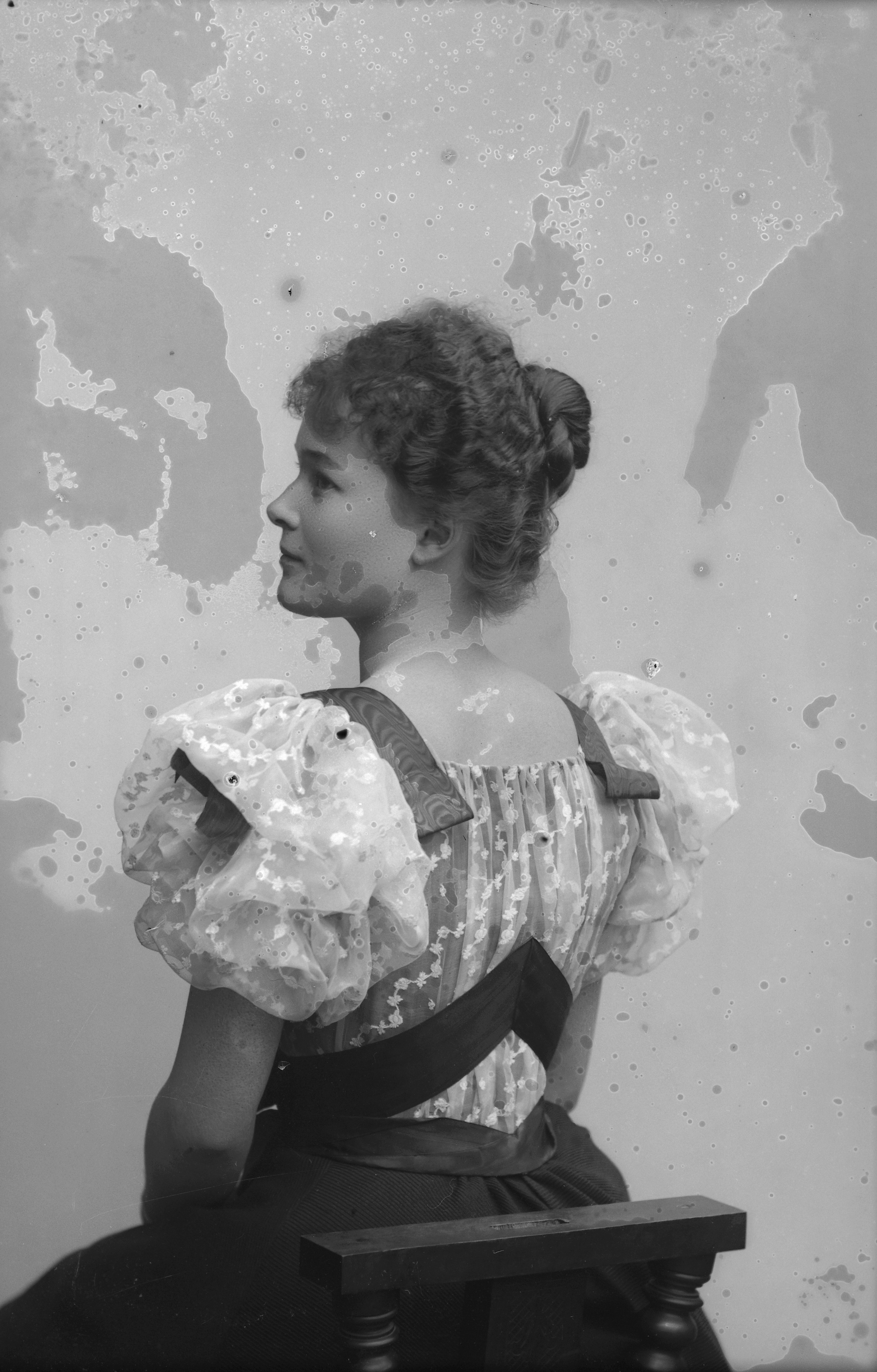 Porträtt i halvfigur av fröken Berg von Linde, rygg snett mot kameran, ansikte i profil.