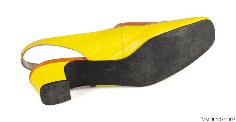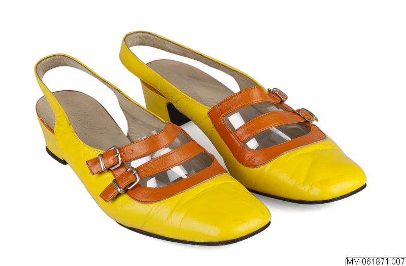 Skor av slingback- modell. Låg fyrkantig klack och bred tvär tå.Öppet vristparti kantat med orange skinn och vristknäppning med 2 orange skinnremmar med metallspännen.