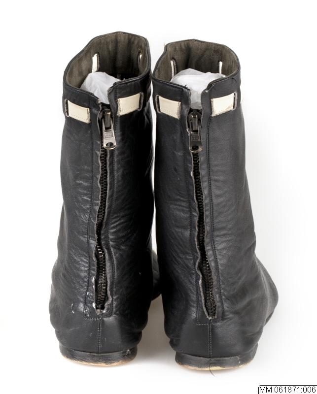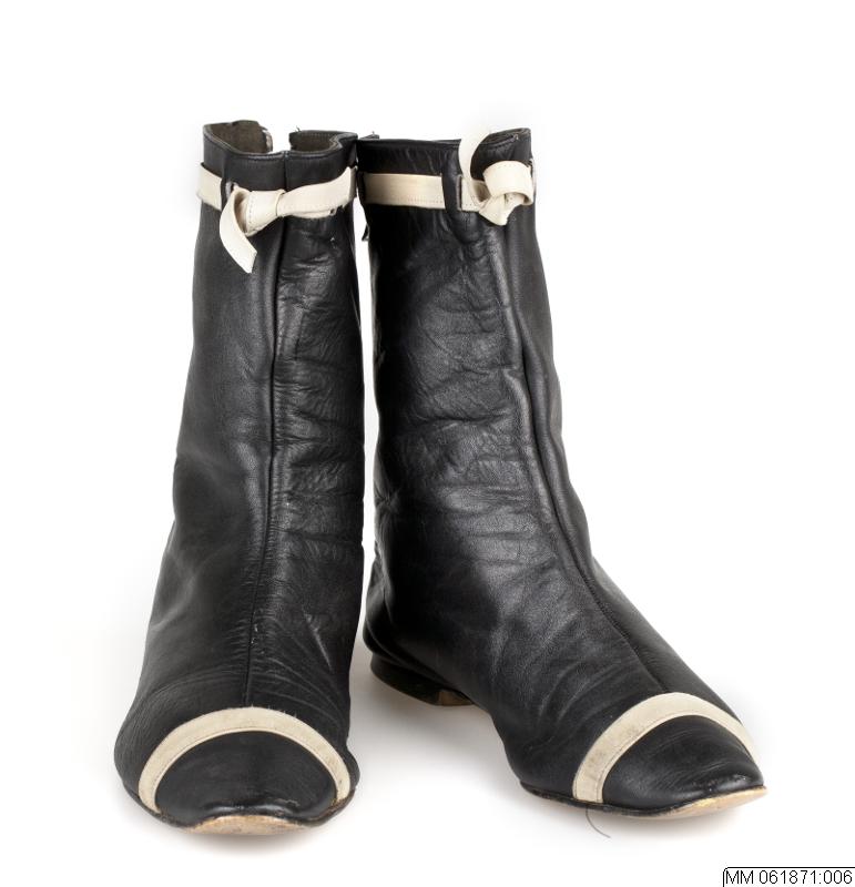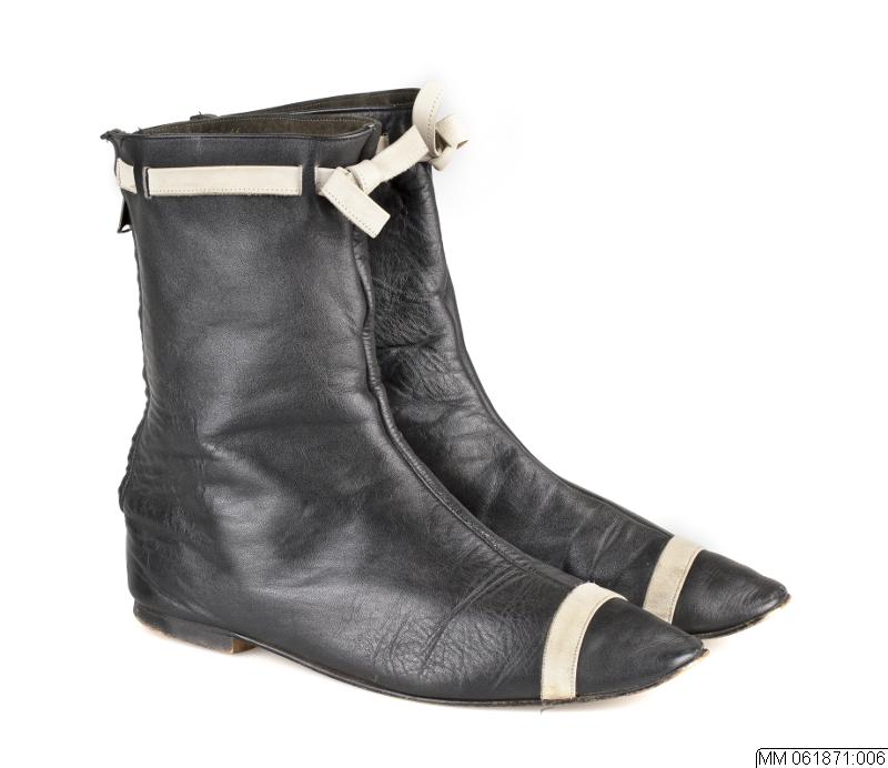 - Låg stövel av svart skinn och spetsig tå. Mittsöm och dragkedja bak. Låg ca 1cm hög klack. Tvärgående vitt skinnband på tåpartiet, upptill avslutning med dekorband i vitt skinn trätt genom slitsar och knutet fram. Inuti stövel stämpel 66 Gyllene Gripen.