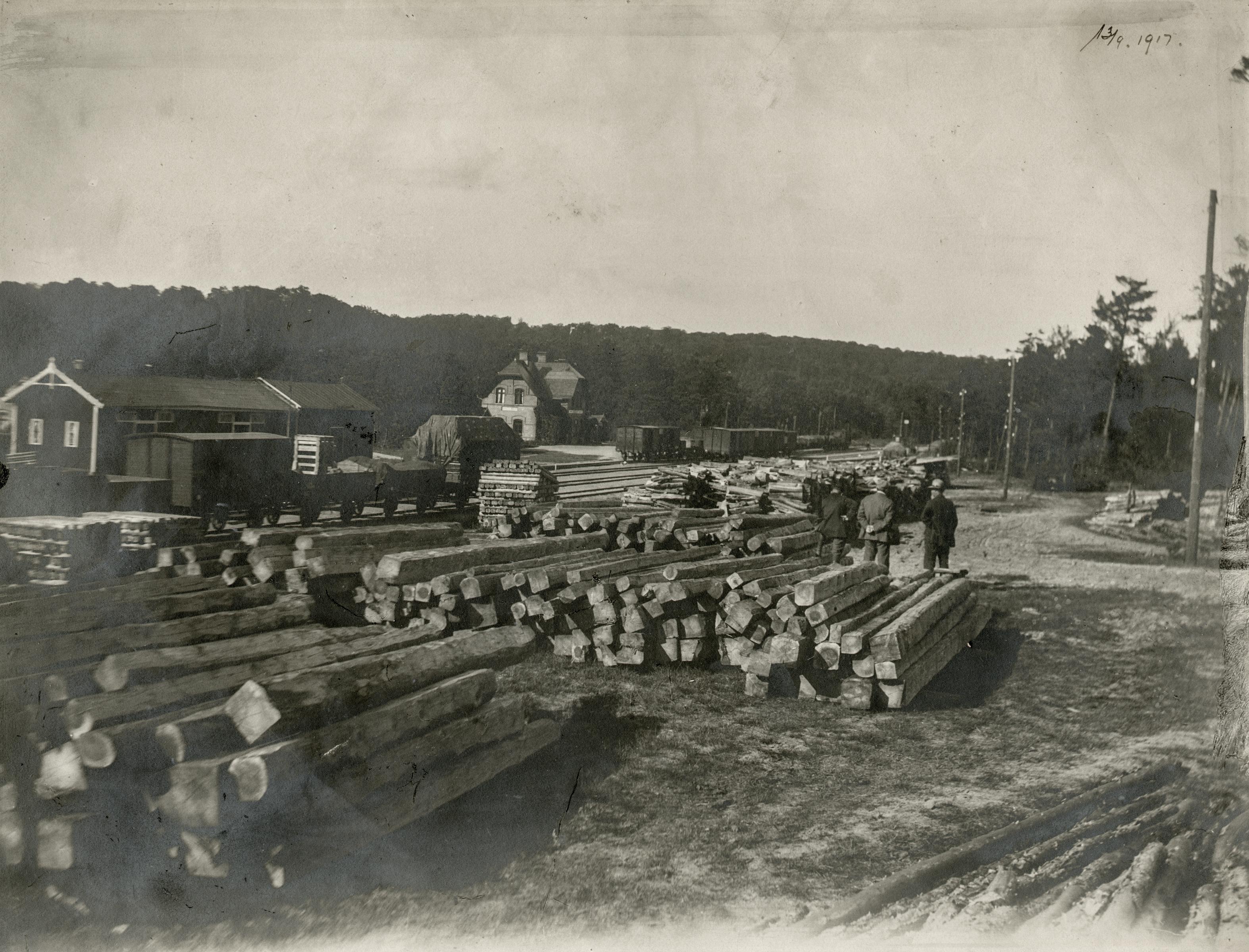 Övedklosters järnvägsstation, godsvagnar med timmer.