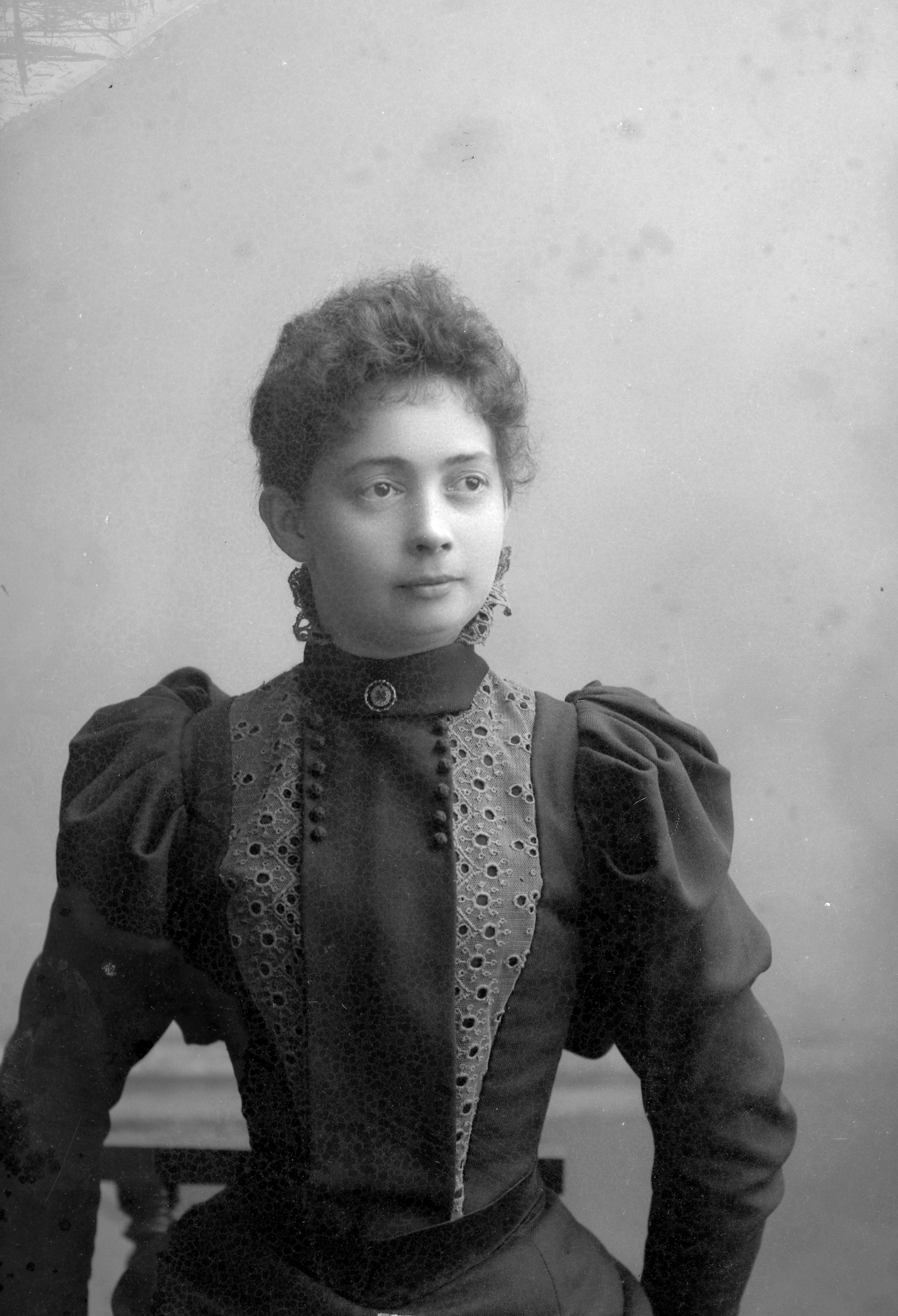 Porträtt i halvfigur av Bengta Elina Dahlström, kappsömmerska vid Ludvig Lindgren & Co.