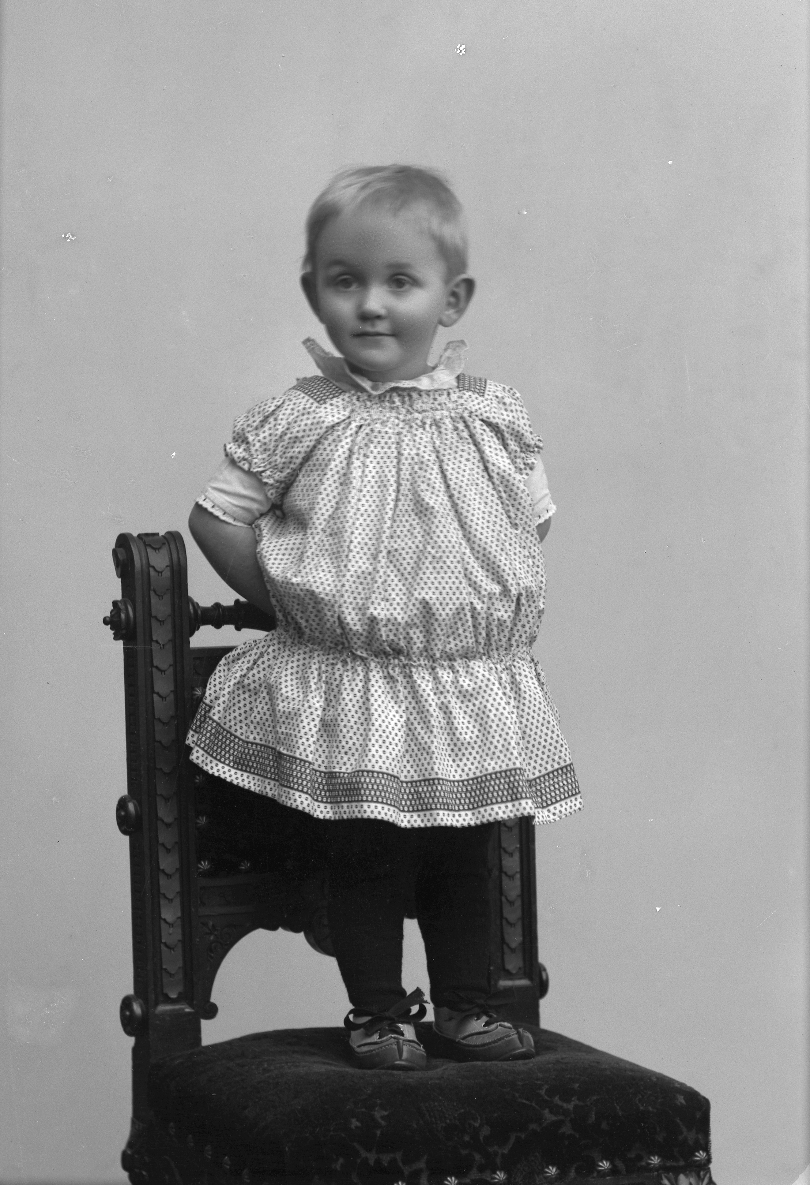Porträtt i helfigur av baron Krusenstiernas dotter, stående på stol.
