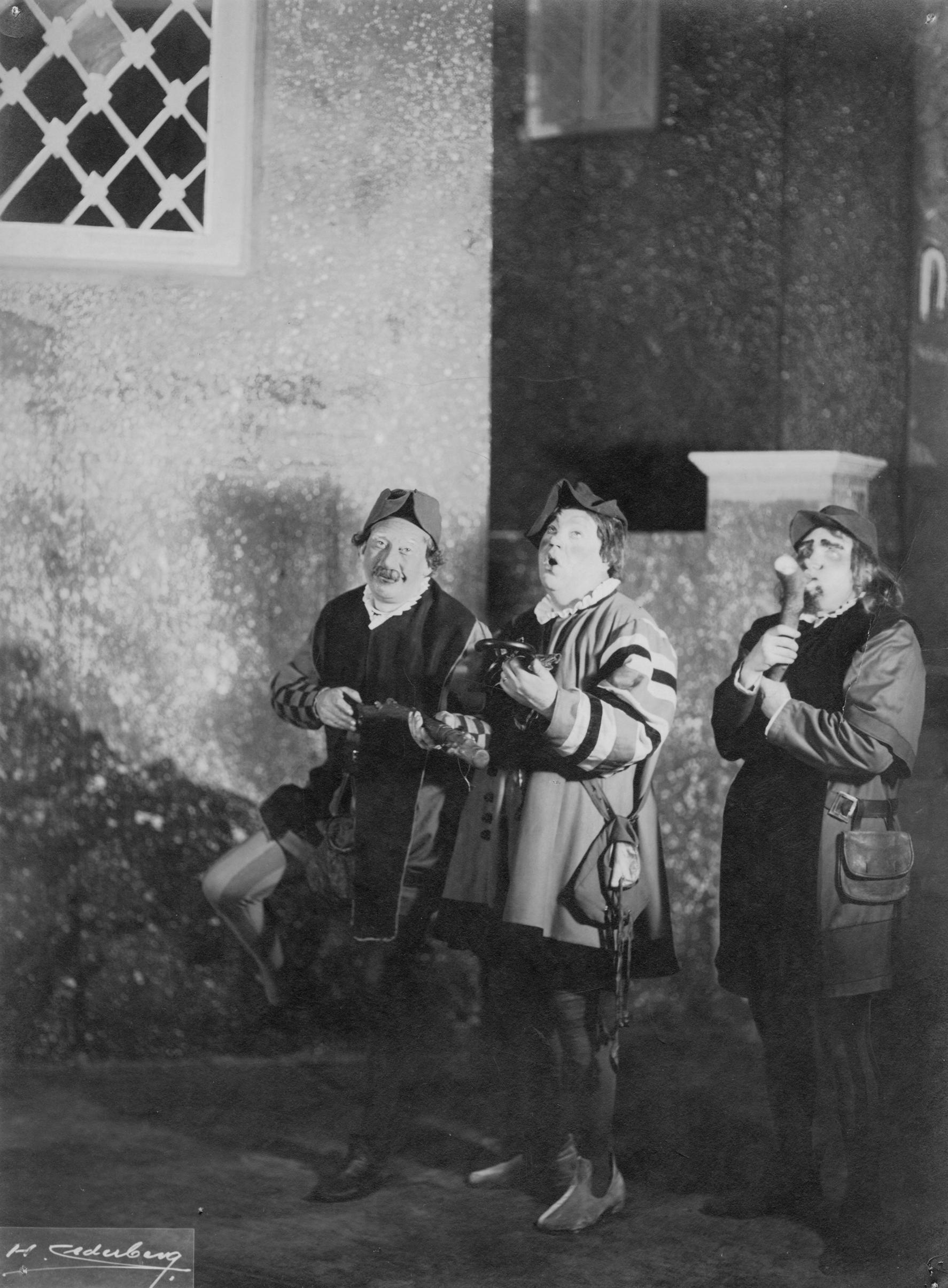 Från vänster: Josef Norman, Edvard Persson och Harald Svensson i operetten "Boccaccio" på Hippodromteatern i Malmö. Männen håller i olika saker och Edvard Persson ser ut som att han ropar eller sjunger (eftersom föreställningen var en operett sjunger han väl sannolikt). Pjäsen hade premiär den 12 november 1926.