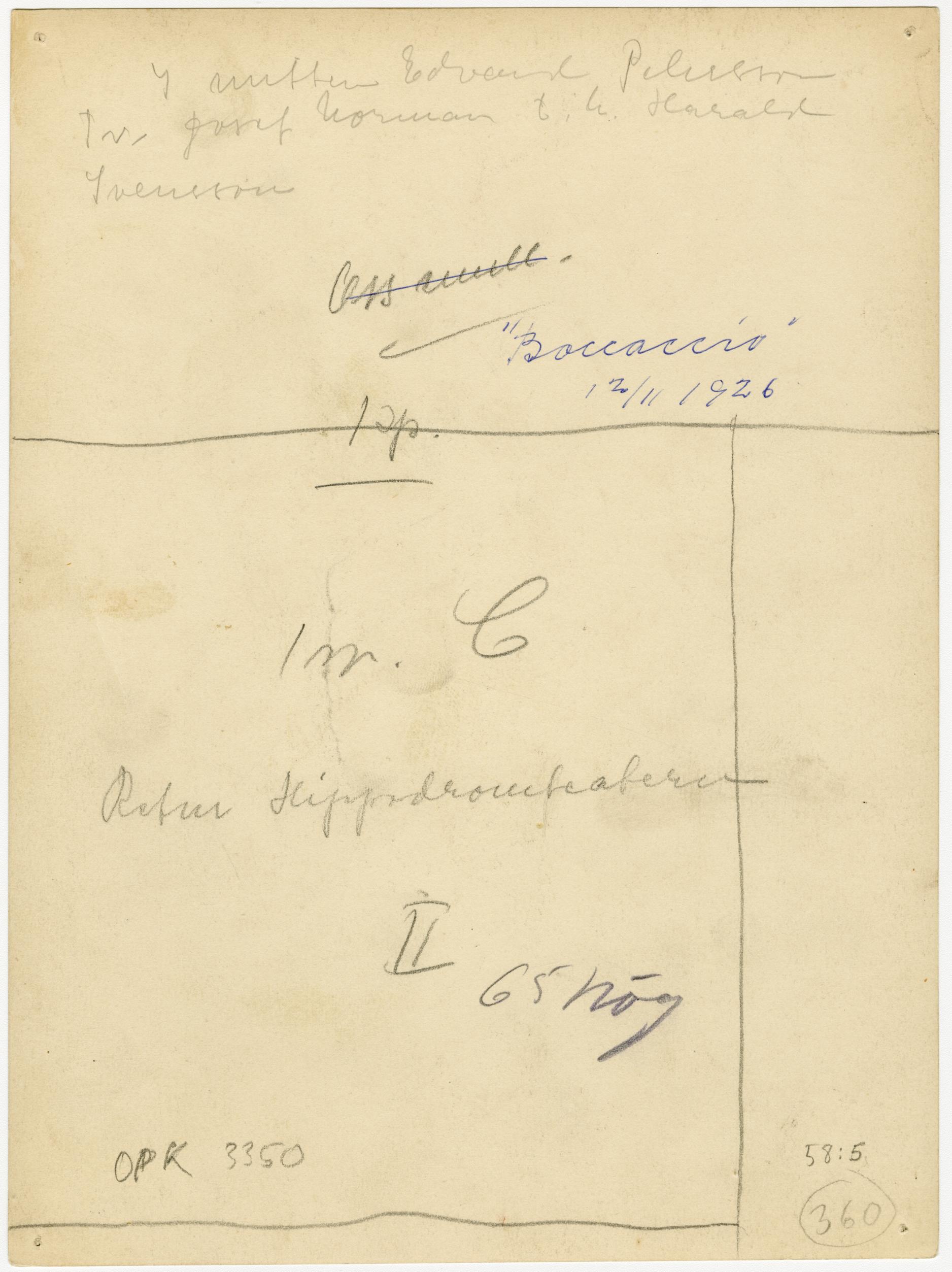 Påskriften lyder: "I mitten Edvard Pehrsson (sic!) Tv, Josef Norman t.h. Harald Svensson" "Boccaccio 12/11 1926". Nere i högra hörnet står "58:5 360 (360 inom en cirkel). Diverse anteckningar och markeringar på baksidan antyder att denna bild har varit publicerad. Bland annat står det "Oss emell." och "Retur Hippodromteatern".