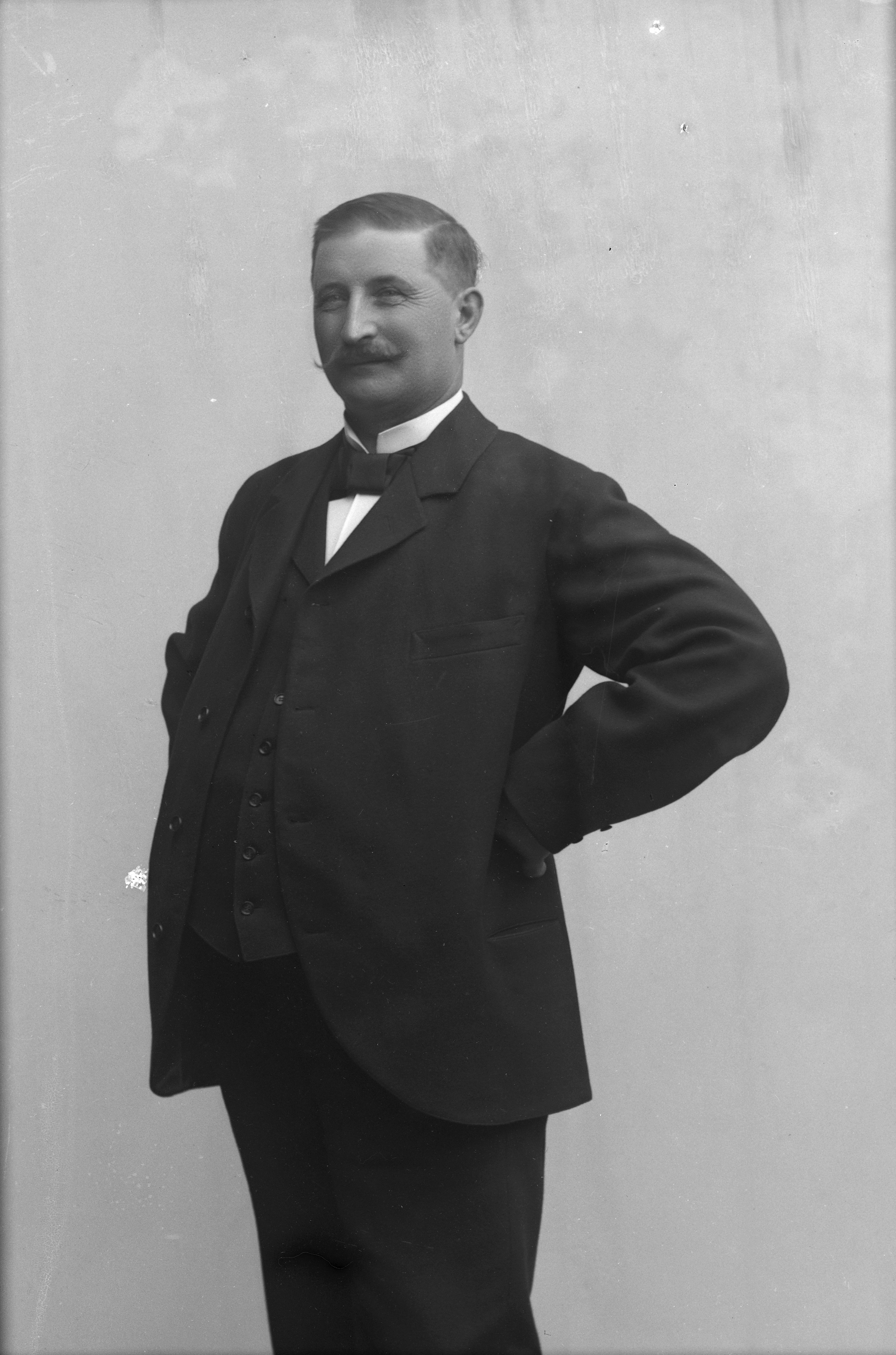 Porträtt i helfigur av lantbrukare H. F. Lindgren.