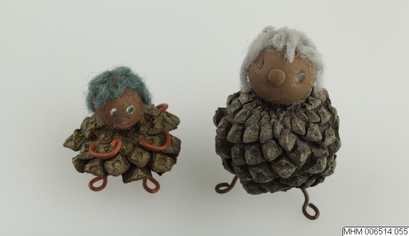 Pynt i form av två små Gubbar, gjorda av kottar med huvuden av lera eller gummit samt metallben.