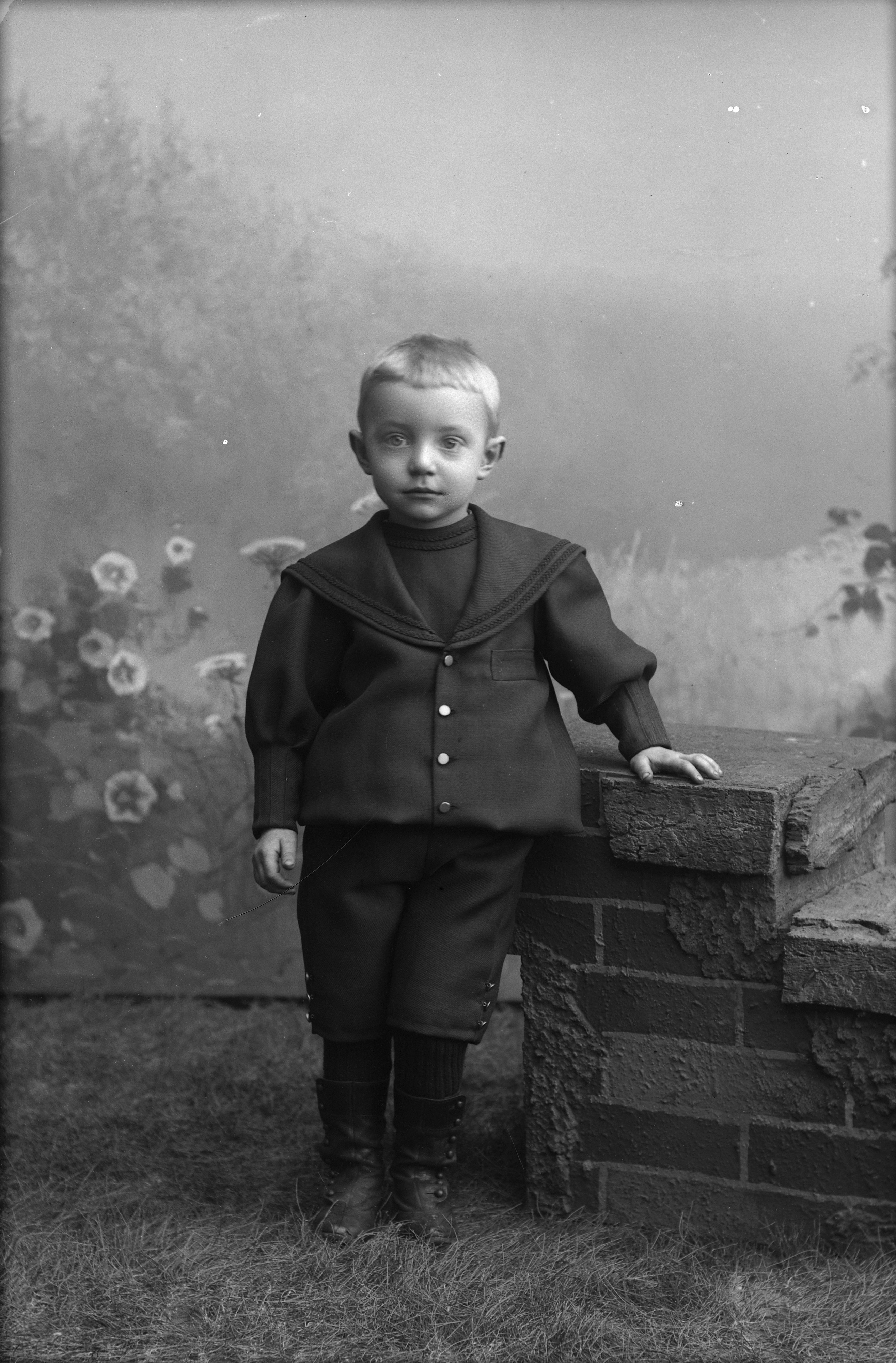 Porträtt i helfigur av fru Nyléns son, iklädd sjömanskostym, stående vid tegelmur, fotograferad framför ateljéfond.