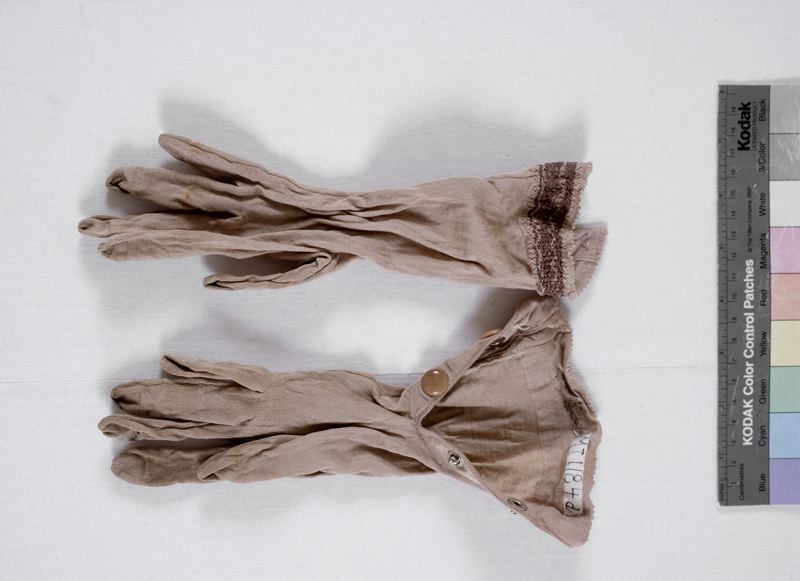 Damvantar av beige konstsilketrikå med liten "krage" upptill med mönsterstickning i brunt. Vantarna märkta på insidan Rap´s Primrose och Magnet. Sprund på insidan med två tryckknappar för knäppning. Beige tryckknappar stämplade Magnet.