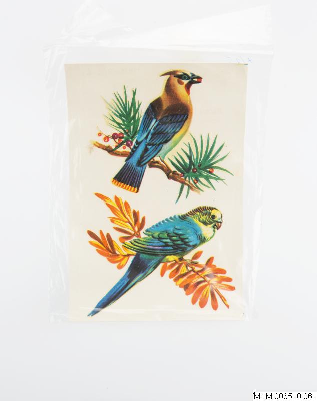 Ett ark med två stycken klistermärken som föreställer fåglar.