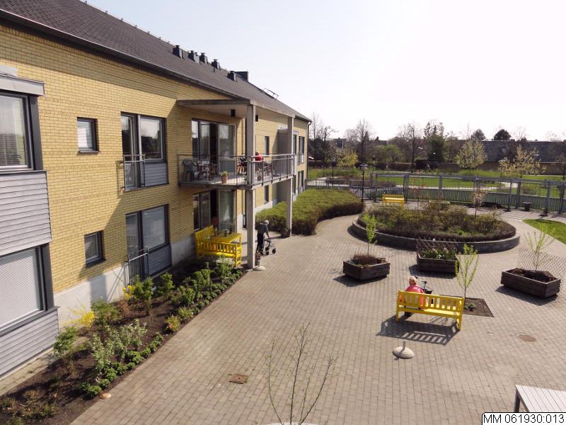 Foto utanför Päronskogens vårdboende med en man som går med rullator.