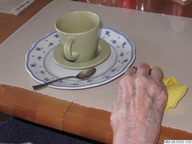 Kaffekopp och gammal hand på Högsåkers vårdboende.