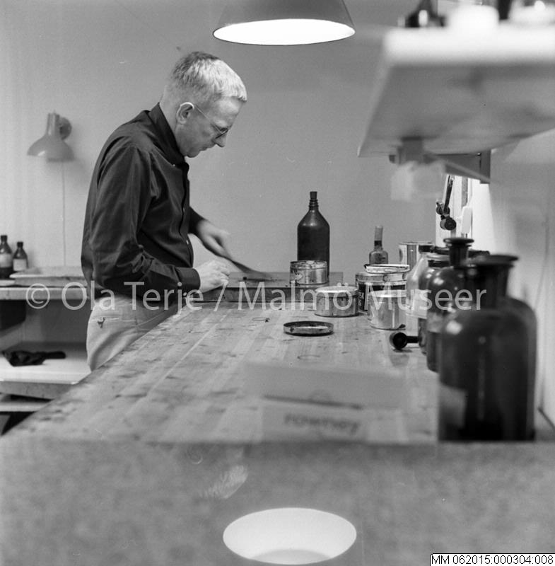 Sven Bunnel (1929-2004) arbetande i sin ateljé. 680203.