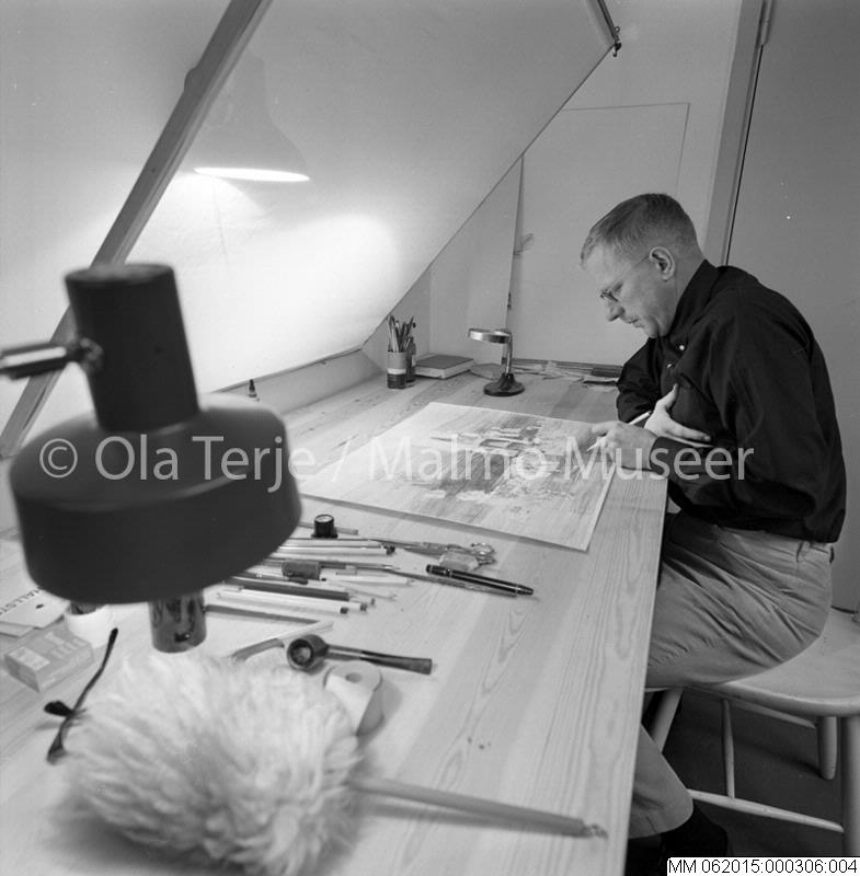 Sven Bunnel (1929-2004) arbetande i sin ateljé. 680203.