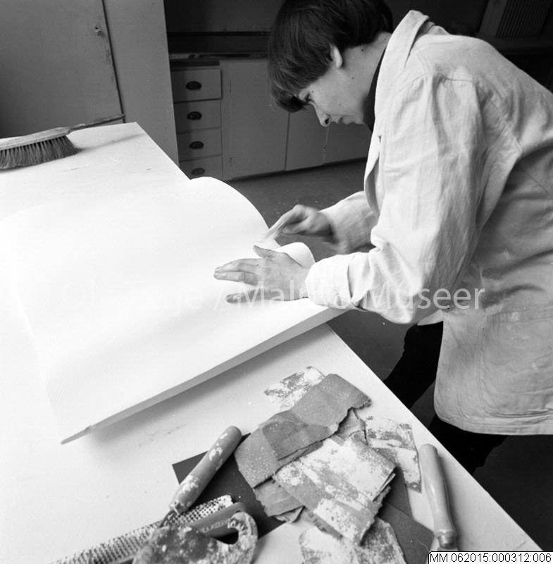 Barbro Bäckström (född 1939) arbetandes i ateljé. 670423.