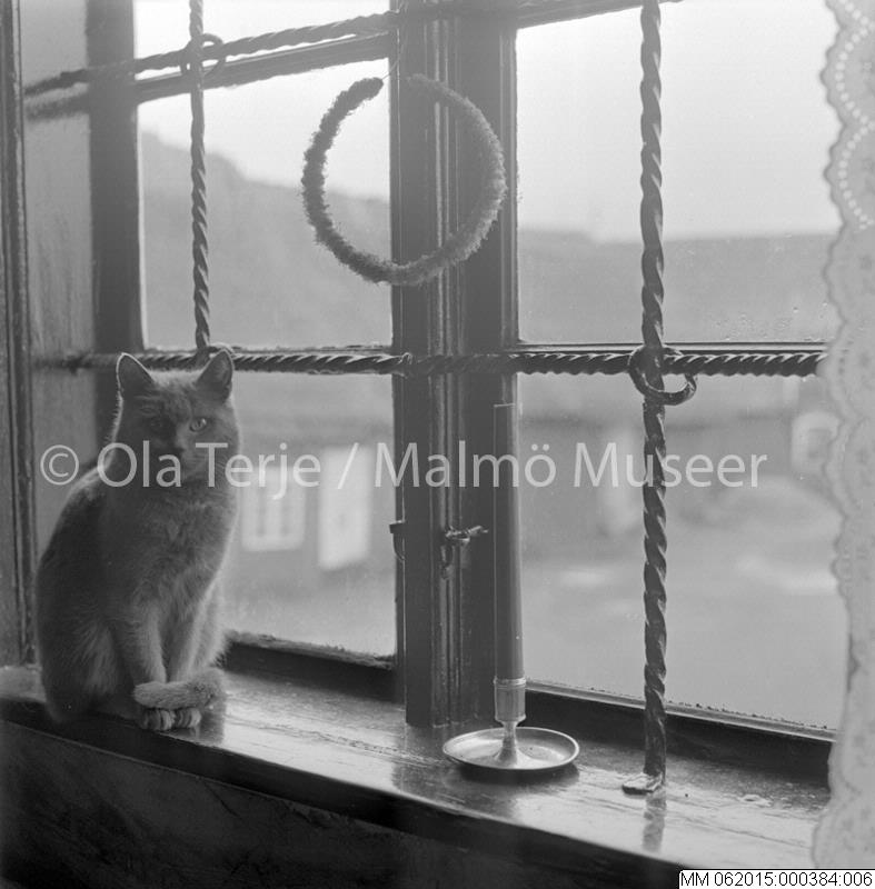 Katt sittande i fönster, Lillemor Rudolf-Hall. 680203. Bilden är tagen i projektet "I Närbild" som gjordes på uppdrag av Skånes Konstförening.