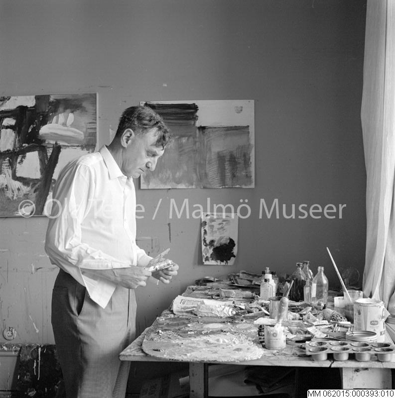 MM 062015:000393:010 :: ateljé, man, arbetsbord, konstnärsmaterial