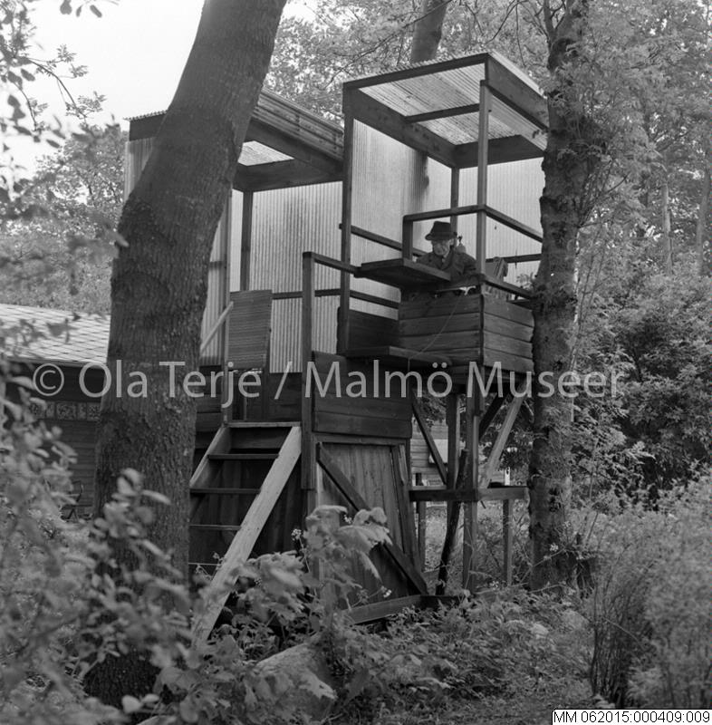 Carl Fredrik "Figge" Holmgren (1875-1969) sittande i utsiktstorn med skissblock, 1967? Bilden är tagen i projektet "I Närbild" som gjordes på uppdrag av Skånes Konstförening.