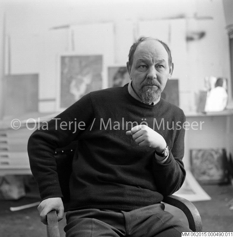 Porträtt av Thormod Larsen (1921-1977) sittande på stol i rumsinteriör. 680224. Bilden är tagen i projektet "I Närbild" som gjordes på uppdrag av Skånes Konstförening.