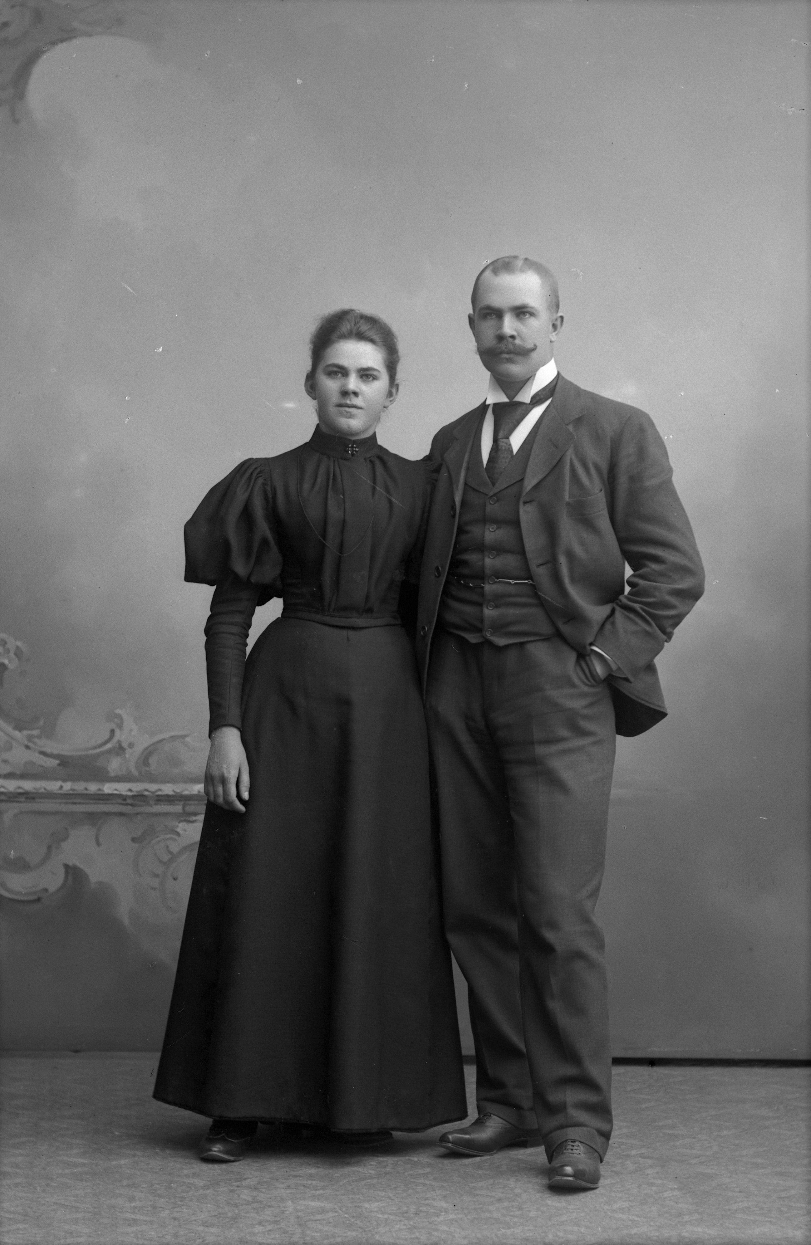 Porträtt i helfigur av herr Möller, kontorist vid firma Edw. H. Thomée, med fru.