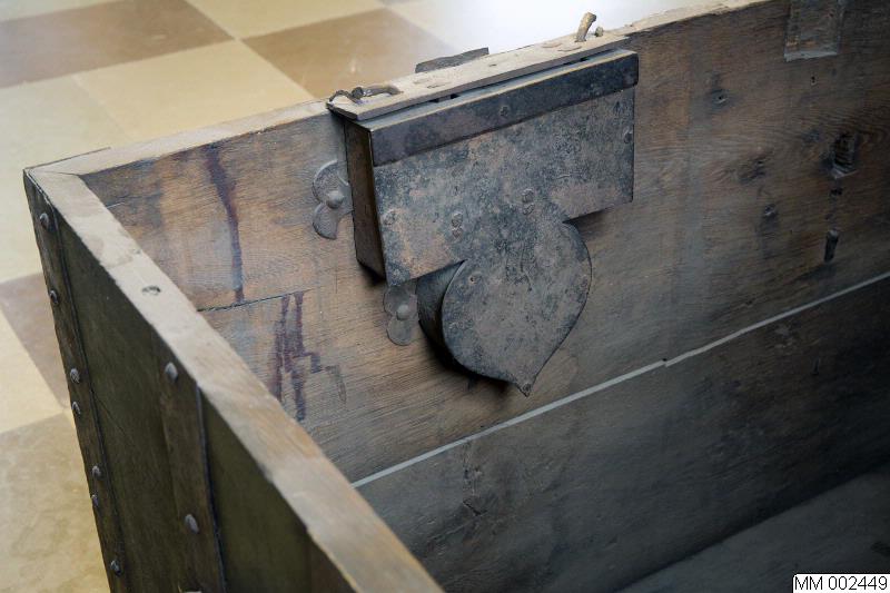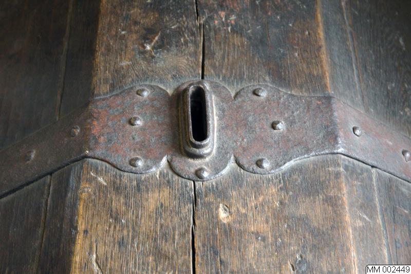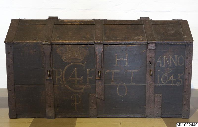 - Kista med järnbeslag, två myntspringor med järnbeslag i locket. Bemålad på framsidan med Christian IVs namnchiffer på högra sidan: R C4 [krönt] F / P. RFP= Regna Firmat Pietas= Fromhet styrker rikene är Christian den IVs valspråk. Bemålad på vänster sida: H / T T/ O samt årtalet: ANNO 1645. HTTO= Herr Tage Ottesen Thott.
