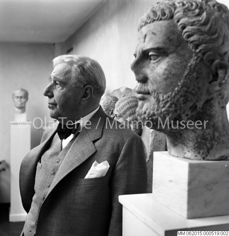 Porträtt av skulptören Henning Malmström (1890-1968) vid sina verk, 1964/1965.