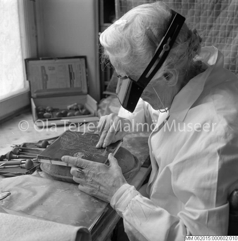 Grafikern Karin Persson (1891-1971) i ateljén, 2/3 1968.