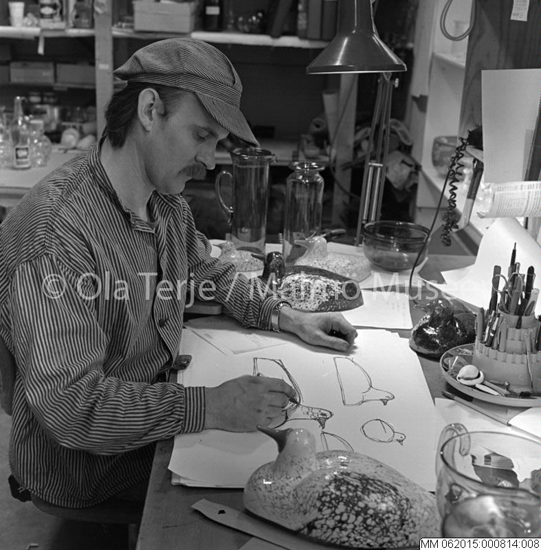 Glaskonstnären Bertil Vallien i ateljén i Åfors. Odaterad.