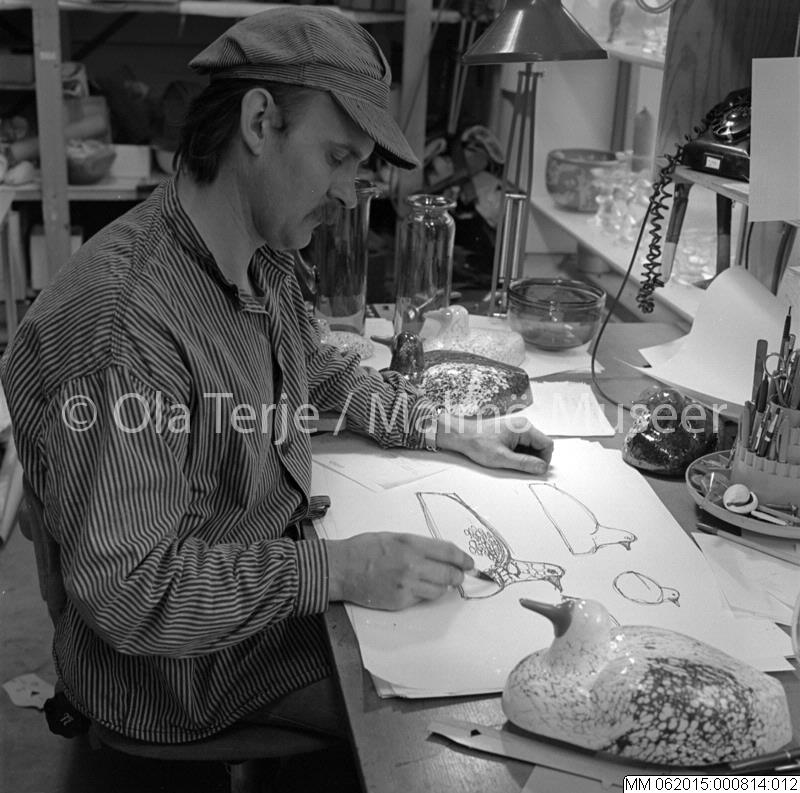Glaskonstnären Bertil Vallien i ateljén i Åfors. Odaterad.