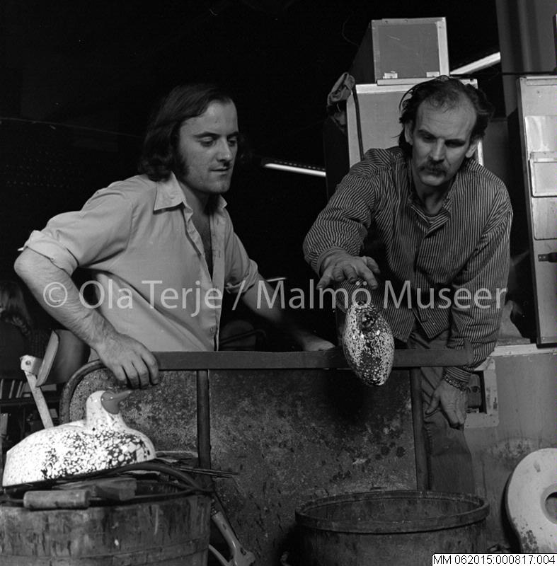 Glaskonstnären Bertil Vallien med glasblåsare i glashyttan i Åfors. Odaterad.