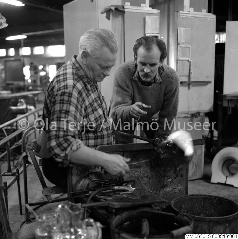 glasblåsare; glashytta; glaskonstnär; man