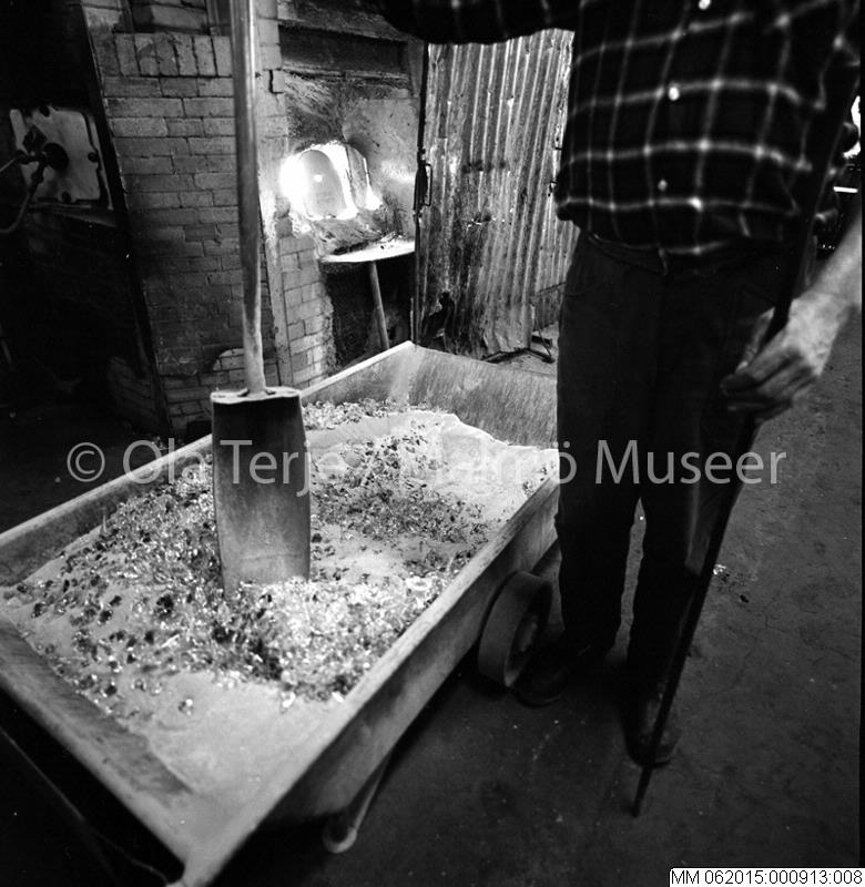 Kärra med glas för eldning i ugn i glashyttan på Åfors glasbruk, april 1969.