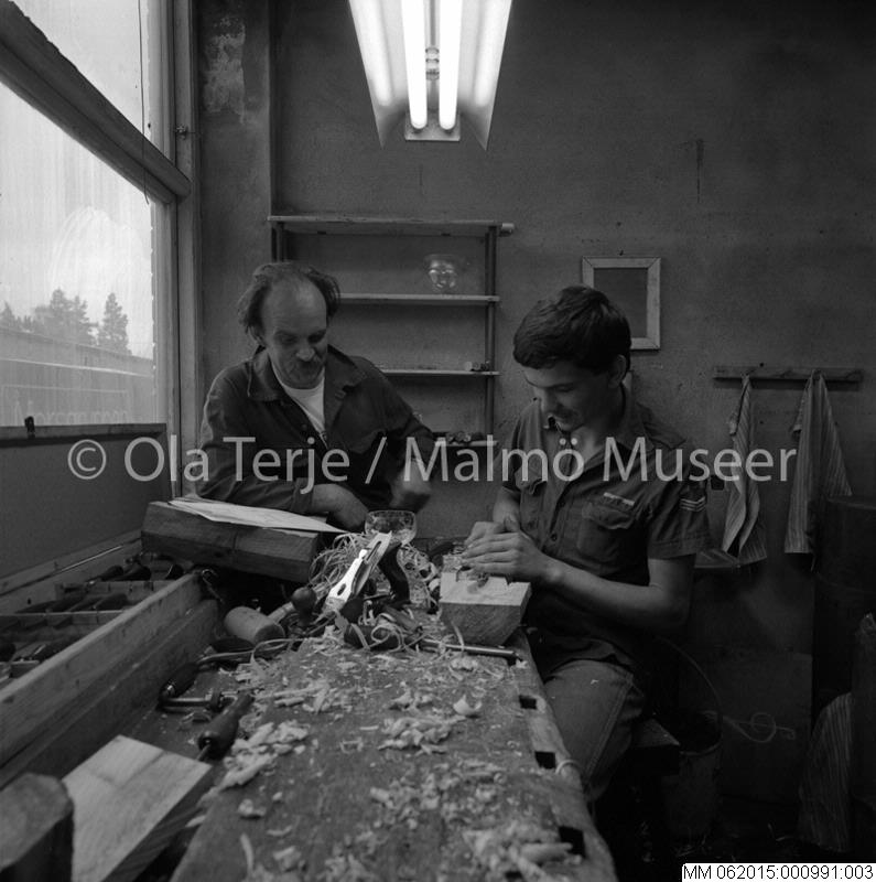 Konstnären Bertil Vallien och medhjälpare i ateljén, Åfors, 810525.