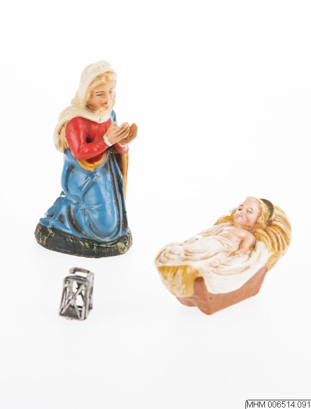 Tre stycken figurer till julkrubba, jungfru Maria, Jesusbarnet samt en stallykta.