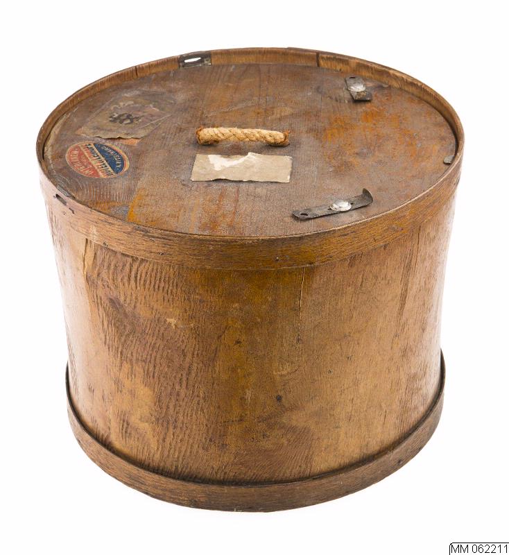 Ask med lock av trä. Rund med raka sidor, lackad på utsidan, brun. Askbottnens sidor av träfanér i ett stycke, fästade samman med spik på invändig fanérremsa. Upptill kantad med ett band av fanér som är fastsatt med 5 runda nitar av vitmetall där ändarna möts, och med två metallskodda hål för låsanordning som finns på locket. Insidan har upptill ett liknande band fastspikat, och ovanför detta ett lockstopp av vitmetall (vinkeljärn). Nedtill kantad med ett band av fanér, fastsatt med både spik och 5 nitar. Botten och lock av gediget trä. Locket med bärrem av en kort repstump som dragits genom två borrade hål och är fastsatt på insidan mot en fastspikad regel (mässingsspik), ändarna skodda med brunt läder och fastspikade mot regeln. På ovansidan låsanordning med två 7 cm långa skenor av metall, vinklade i den ena ändan, den andra med runt hål, avlång öppning där de är fastsatta genom locket med en nit/klämma av vitmetall. Fraktkvitton på locket och dito rester på sidan, med text: