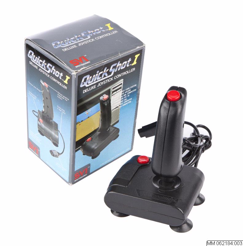 - Medföljer förpackning i pappaer med färgtryck. Bredd 120 mm, djup 100 mm, höjd 160 mm. Text bland annat: Instryctions och kompabilitetslista. Quick Shot I Deluxe Joystick Controller SVI Spectravideo. Copyright 1984 Spectravideo Interbational Limited.