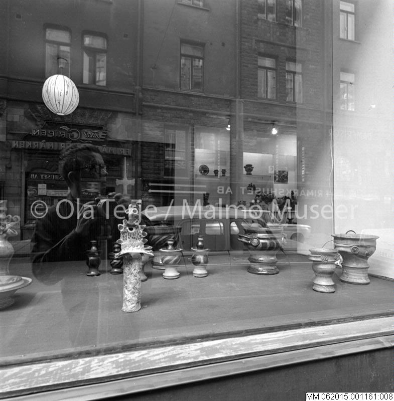 Konstnären Ulrika Hydman Valliens utställning på Konsthantverkarna, på Mäster Samuelsgatan i Stockholm, 1960-tal. Ola Terjes spegelbild i fönstret.