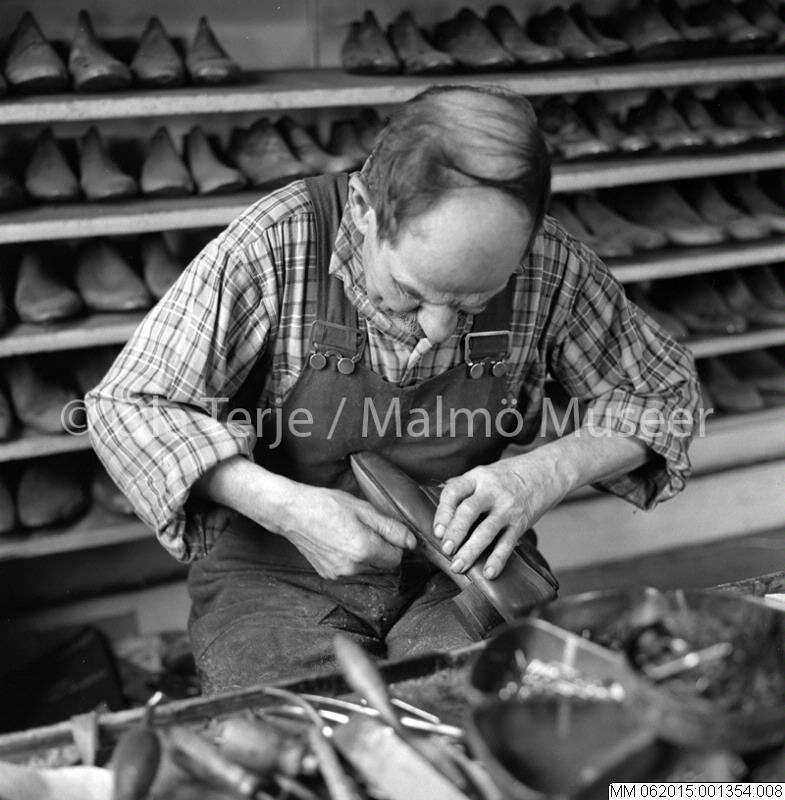 Skomakare Erik Beckman i arbete på skomakeriet, hylla med skomakarläster i bakgrunden, Fiskargatan 30 i Kalmar 23/4 1970.